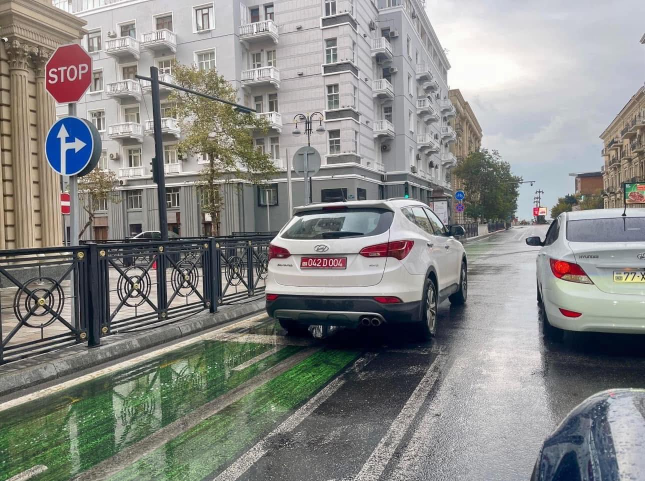 Digər fotoda isə diplomatik nömrə nişanlı "Hyundai" markalı avtomobil velosiped zolağında park edilib.