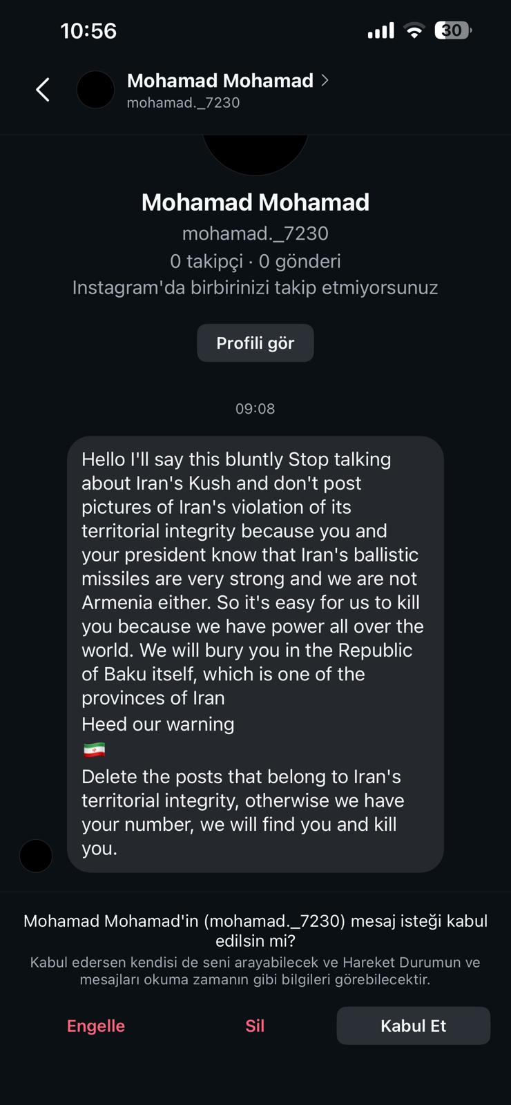 Avtosfer.az xəbər verir ki, gələn mesajlarda müxtəlif profillərdən — bəzilərinin İran xüsusi xidmət strukturları ilə əlaqəli ola biləcəyi ehtimal edilir — bloq müəllifinə ölümlə bağlı hədələr ünvanlanır. Təhdidlərin əsas motivi kimi videolarda Təbriz, Culfa, Ərdəbil, Urmiya və digər bölgələrə aid yeməklərin hazırlanması, həmçinin paylaşımlarda Azərbaycan bayrağının görünməsi göstərilir. Bu vizualların bəziləri İran daxilində radikal qruplar tərəfindən “siyasi mesaj” kimi interpretasiya olunub və koordinasiyalı hücumlara gətirib çıxarıb.