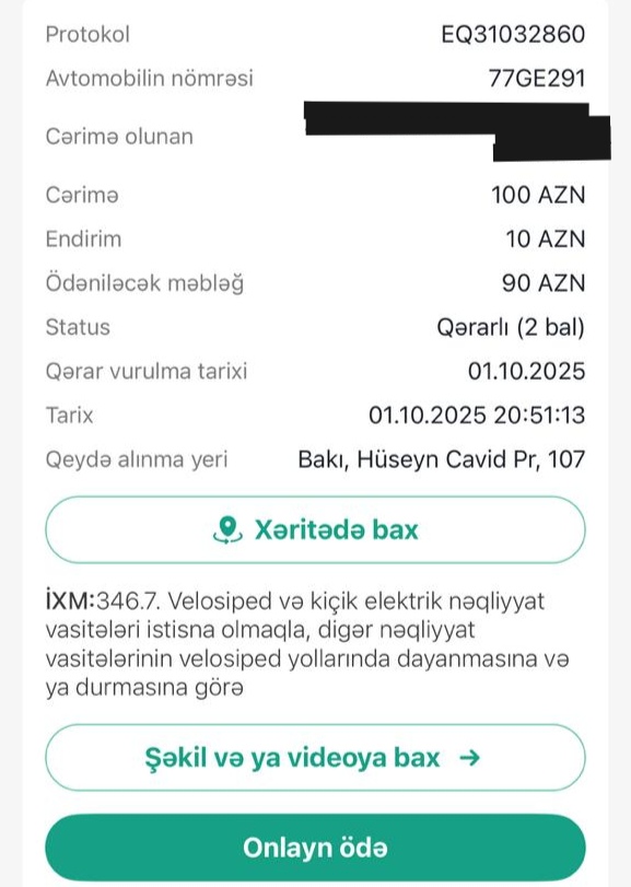 Bakıda haqsız yerə cərimələndiyini iddia edən sürücü redaksiyamızın qaynar xəttinə şikayət ünvanlayıb. O bildirir ki, 77-GE-291 qeydiyyat nişanlı "Hyundai" markalı avtomobili oktyabrın 1-də, paytaxtın Hüseyn Cavid prospektində park edib. Avtosfer.az xəbər verir ki, dayanma-durmanı qadağan edən heç bir hal olmadığı halda onun barəsində İnzibati Xətalar Məcəlləsinin 346.7-ci maddəsilə 2 bal 100 manat məbləğində cərimə tətbiq edilib. Məlum olub ki, elektron qərar velosiped zolağında park edilməyə görə tərtib olunub. Lakin qeydə alınmış fotolardan da aydın şəkildə görünür ki, dirək üzərində 4.5 nişanı olsa da, asfalt üzərində nişanlanma xətti yoxdur. Hərəkətin təşkilində natamamlıq olduğu halda sürücüyə cərimə yazılması doğru hesab olunmur.