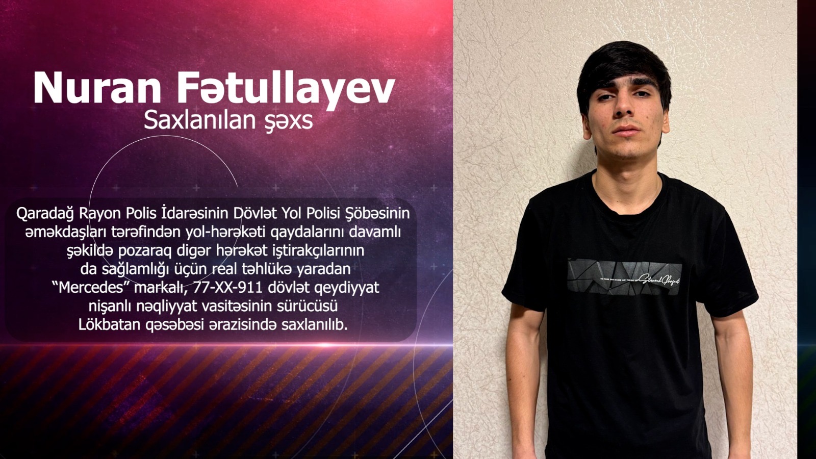 Qaradağ Rayon Polis İdarəsinin Dövlət Yol Polisi Şöbəsinin əməkdaşları tərəfindən yol hərəkəti qaydalarını davamlı şəkildə pozaraq digər hərəkət iştirakçılarının da sağlamlığı üçün real təhlükə yaradan “Mercedes” markalı, 77-XX-911 dövlət qeydiyyat nişanlı nəqliyyat vasitəsinin sürücüsü Nuran Fətullayev Lökbatan qəsəbəsi ərazisində saxlanılıb.