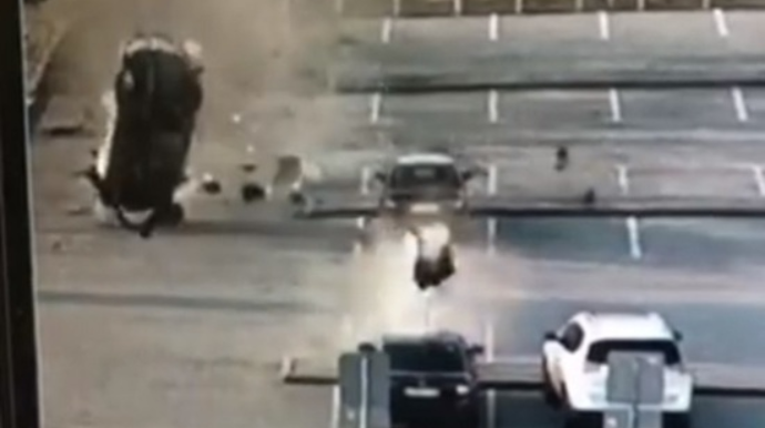 Kadrlarda, “Volkswagen Polo” markalı avtomobilin sürətlə idarə edildiyi və sürücünün sükan idarəetməsini itirməsi səbəbindən hava limanı ərazisində yerləşən avtodayanacağının daş bordürünə çırpıldığı görülür. Zərbənin təsirindən havaya qalxan avtomobil bir neçə dəfə çevrilir və maşından çıxan mühərrik park edilmiş avtomobilin üzərinə düşür.