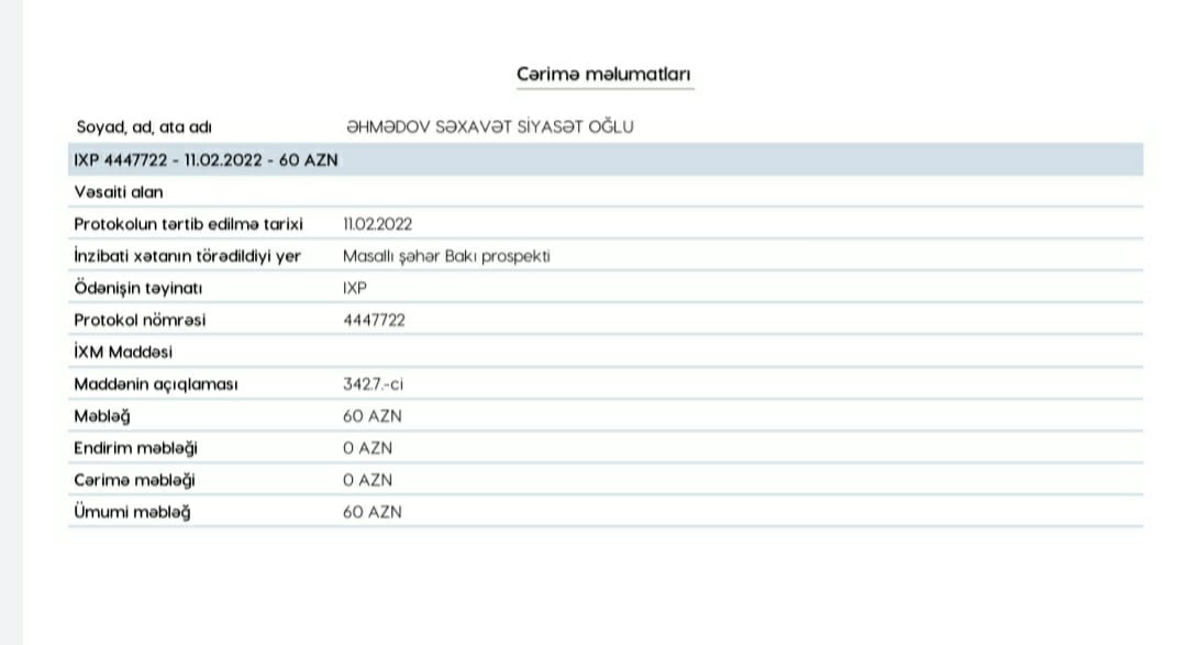 Əsassız cərimələndiyini bildirən sürücü Səxavət Əhmədov Baş Dövlət Yol Polisi İdarəsinin rəhbərliyindən məsələni ciddi şəkildə araşdıraraq protokolun ləğv edilməsini və polis əməkdaşlarının cəzalandırılmasını xahiş edir.