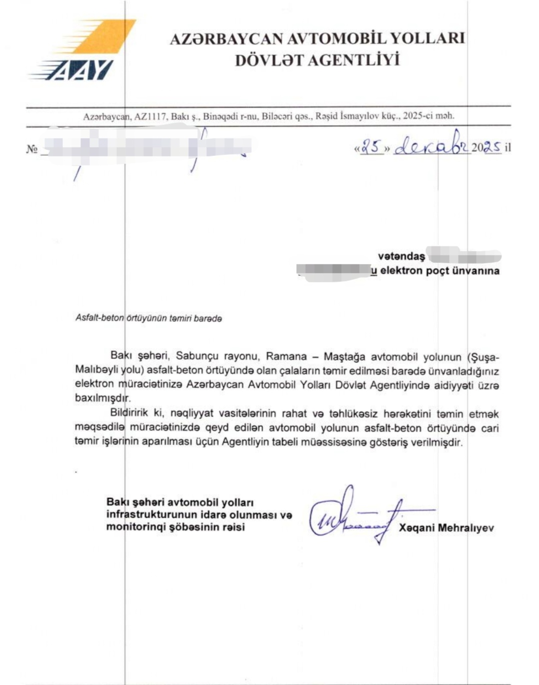 Sakinlərin sözlərinə görə, mövcud problemlə bağlı dəfələrlə Azərbaycan Avtomobil Yolları Dövlət Agentliyinə (AAYDA) müraciət edilib. Yolun təmir olunacağı ilə bağlı vəd verilsə də, problem hələ də öz həllini tapmayıb. Hətta sakinlərin rəsmi müraciətinə verilmiş cavabda təmir işlərinin aparılması üçün aidiyyəti quruma göstəriş verildiyi bildirilsə də, həmin göstəriş indiyədək icra olunmayıb.