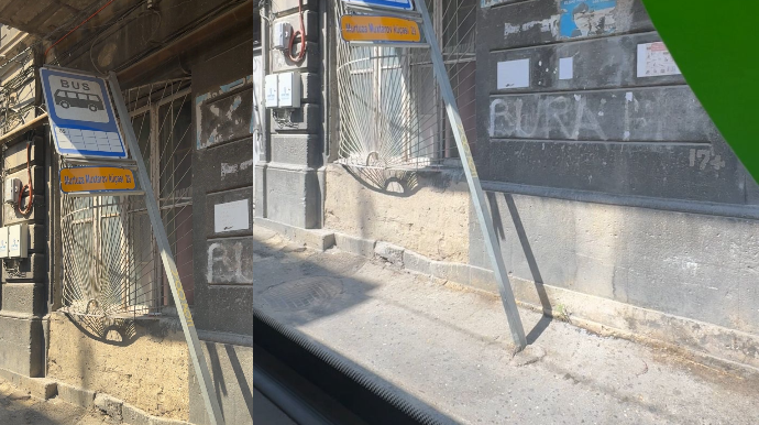 Avtosfer.az-ın sosial media hesabına göndərilən videomüraciətdə qeyd olunub ki, Murtuza Muxtarov küçəsində baş vermiş yol-nəqliyyat hadisəsindən sonra ictimai nəqliyyatla bağlı məlumat nişanı qəzalı vəziyyətdədir və hər an aşa bilər.
