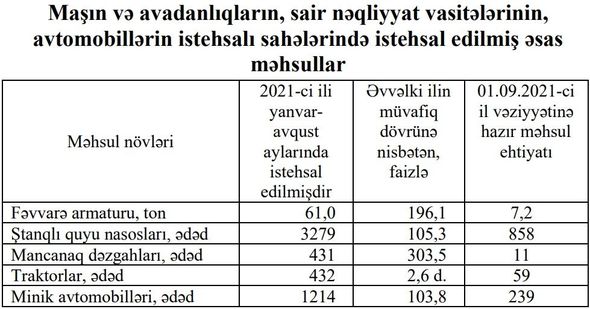 Əvvəlki ilin müvafiq dövrü ilə müqayisədə maşın və avadanlıqların istehsalı 1,8 faiz artıb, avtomobil, qoşqu və yarımqoşquların istehsalı 38,5 faiz, digər nəqliyyat vasitələrinin istehsalı isə 69,8 faiz azalıb.