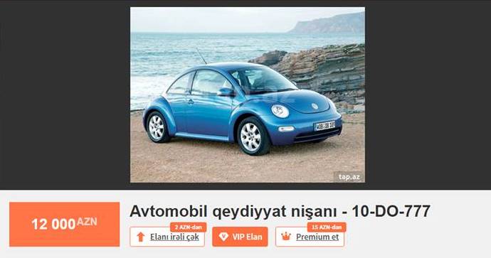 Digər bir elanda isə 10-DO-777 dövlət nömrə nişanının 12 000 manata satıldığı qeyd olunub.