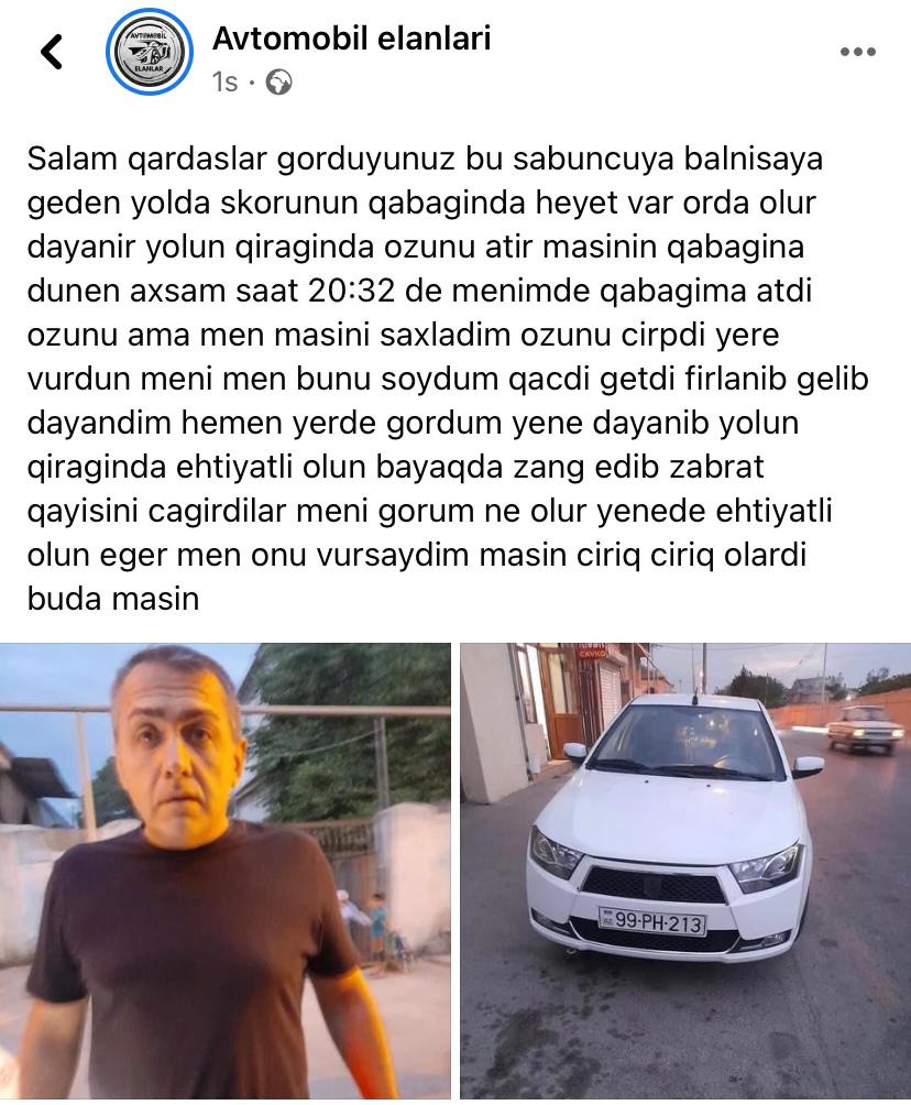 Avtosfer.az xəbər verir ki, onlardan biri də Sabunçu rayonu ərazisində 99-PH-213 dövlət nömrə nişanlı avtomobilin sürücüsünün qarşısına çıxıb. Həmin avtomobilin sürücüsü bununla bağlı sosial şəbəkələrdə paylaşım edərək bildirib ki, dünən axşam saat 20:32 radələrində Sabunçu rayonu ərazisindəki 3saylı xəstəxananın qarşısında bir nəfər özünü avtomobilin önünə atıb. Sürücü dərhal reaksiya verərək maşını saxlaya bilib. Bunu görən həmin şəxs özünü yerə çırparaq “məni vurdun” - deyə qışqırmağa başlayıb. Sürücü isə maşından düşərək həmin şəxsi söyüb və onun yalan danışdığını deyib. Bundan sonra fotoda gördüyünüz bu şəxs hadisə yerindən qaçıb. Sürücü bildirir ki, bir qədər əvvəl yol polisindən zəng edərək onu şöbəyə dəvət ediblər. Sürücü o şəxsi vurmadığını sübut etmək üçün avtomobilinin fotosunu da paylaşıb və bildirib ki, hər hansı bir yol nəqliyyat hadisəsi baş verməyib. Sadəcə olaraq həmin şəxs özünü avtomobilin qarşısına ataraq ondan pul qoparmaq niyyətində olub.
