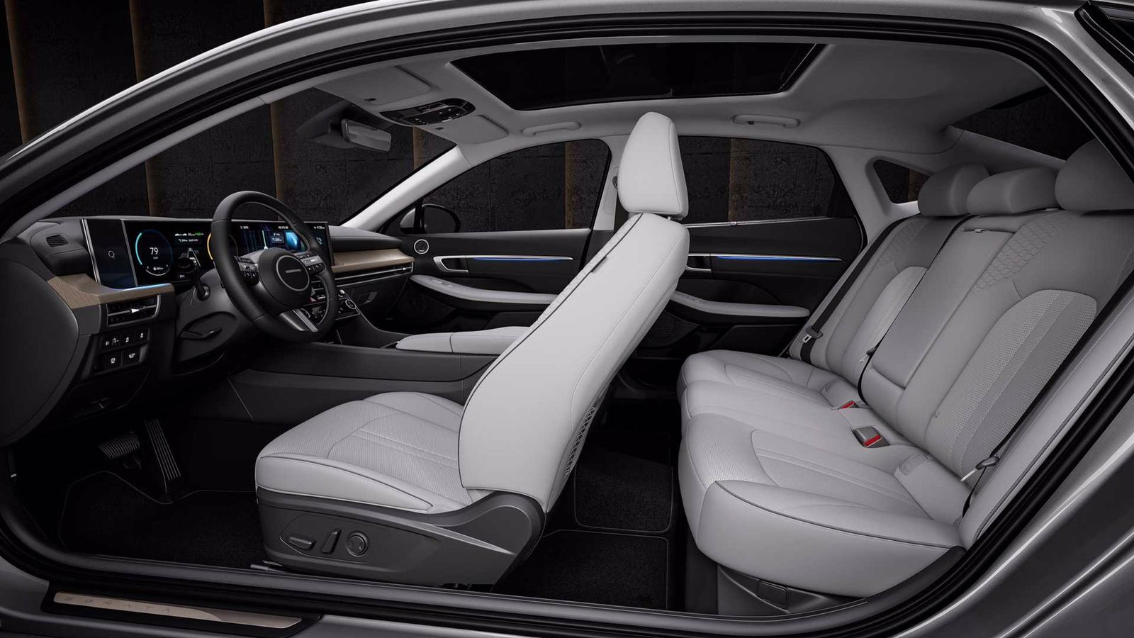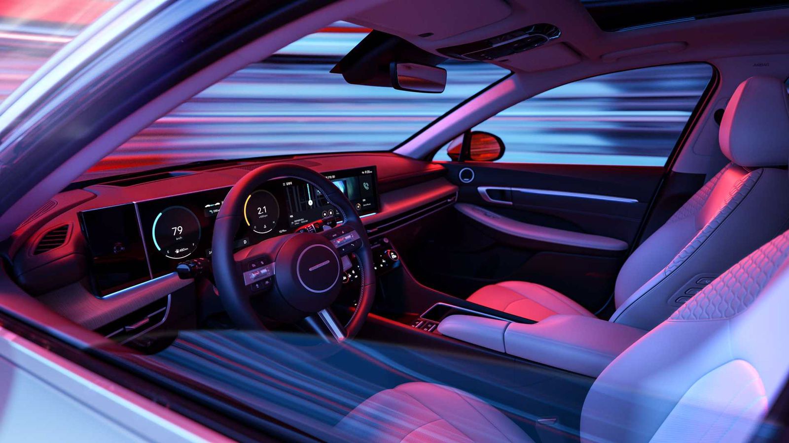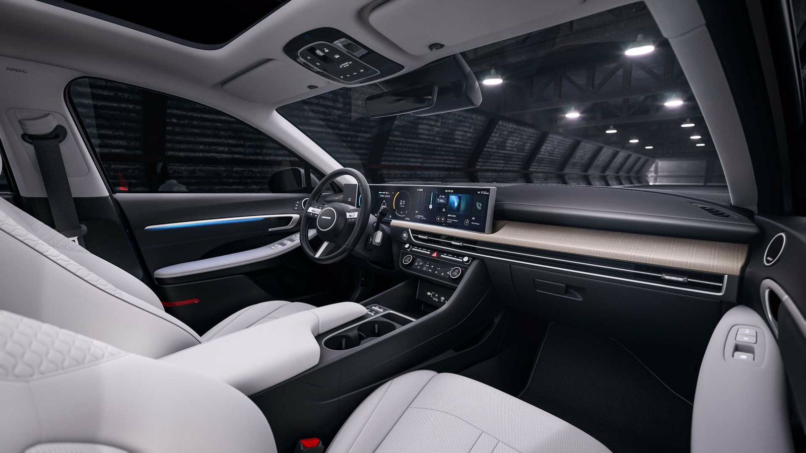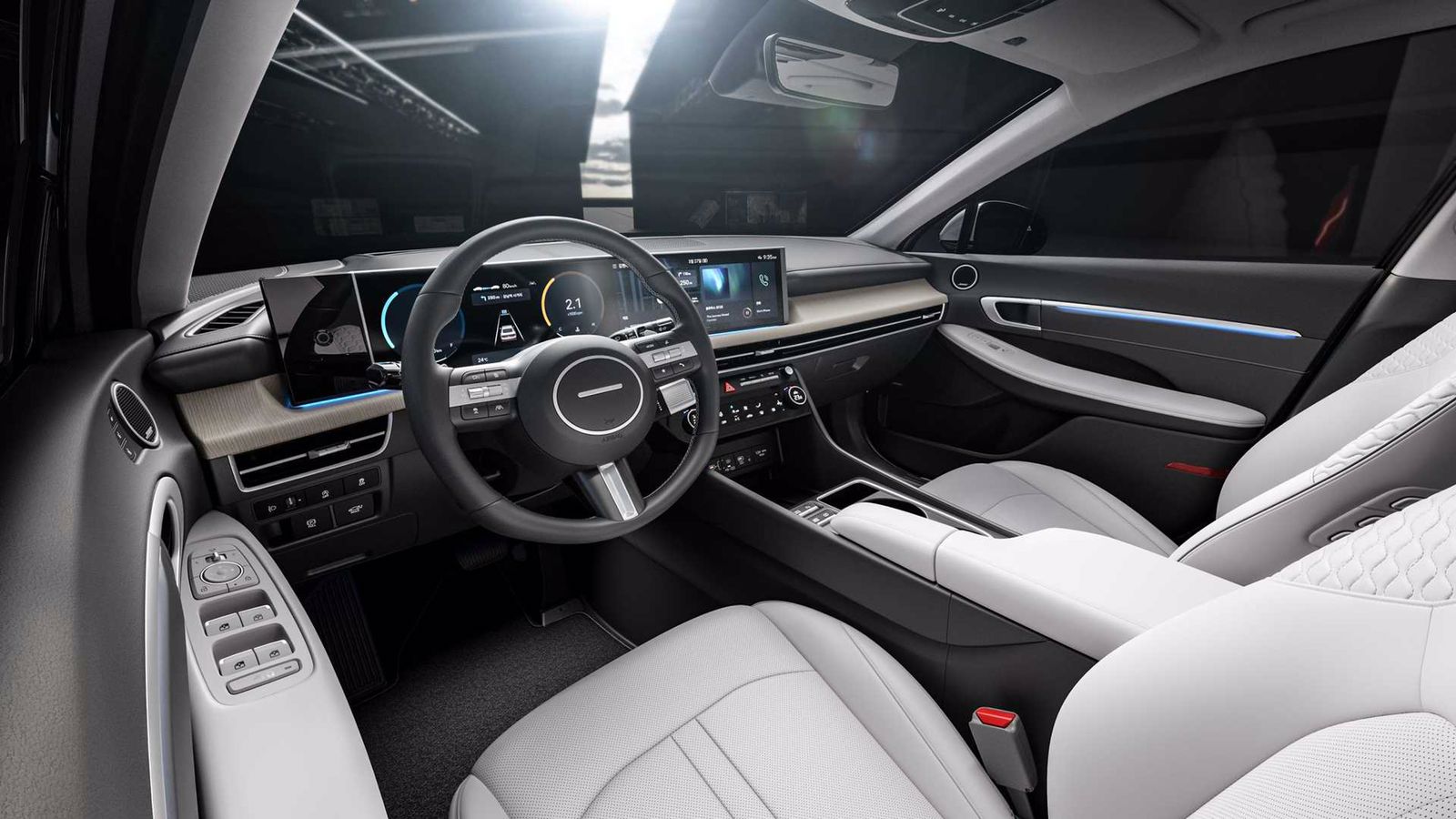 Modelin iç dizaynına baxdığımız zaman dəyişimin müqayisə olunmayacaq qədər artdığını görə bilərik. Qrimlənmiş “Sonata”, “BMW”nin “iDrive 8” sistemi ilə tanış olan ilk “Hyundai” modelidir deyə bilərik. Belə ki, salonda 12.3 qarışlıq böyüklüyə sahib rəqəmsal idarə paneli və məlumat-əyləncə sistemi monolit ekrana quraşdırılıb. Lakin “BMW” toxunmalı düymələrə vida etsə də, “Hyundai” onları saxlamağa davam edir.