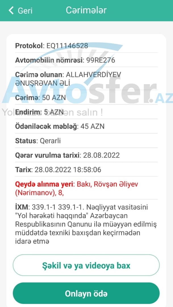 Qeyd edək ki, İnzibati Xətalar Məcəlləsinin 122.1-ci maddəsində qeyd edilib ki, bu məcəllənin 329.1, maddələsində nəzərdə tutulmuş xəta foto və ya video qeydiyyat funksiyalarına malik xüsusi texniki vasitələrin köməyi ilə aşkar edildikdə, xüsusi texniki vasitələrin məlumatları müvafiq icra hakimiyyəti orqanının mərkəzi informasiya sisteminin proqram təminatı əsasında real vaxt rejimində elektron formada birbaşa həmin mərkəzi informasiya sisteminə ötürülür. Qanunvericiliyin bu müddəasında aydın şəkildə qeyd olunub ki, texniki baxışı bitmiş nəqliyyat vasitəsinin sürücüsü planşet vasitəsilə deyil, real vax rejimində işləyən kamera vasitəsilə məsuliyyətə cəlb edilə bilər.