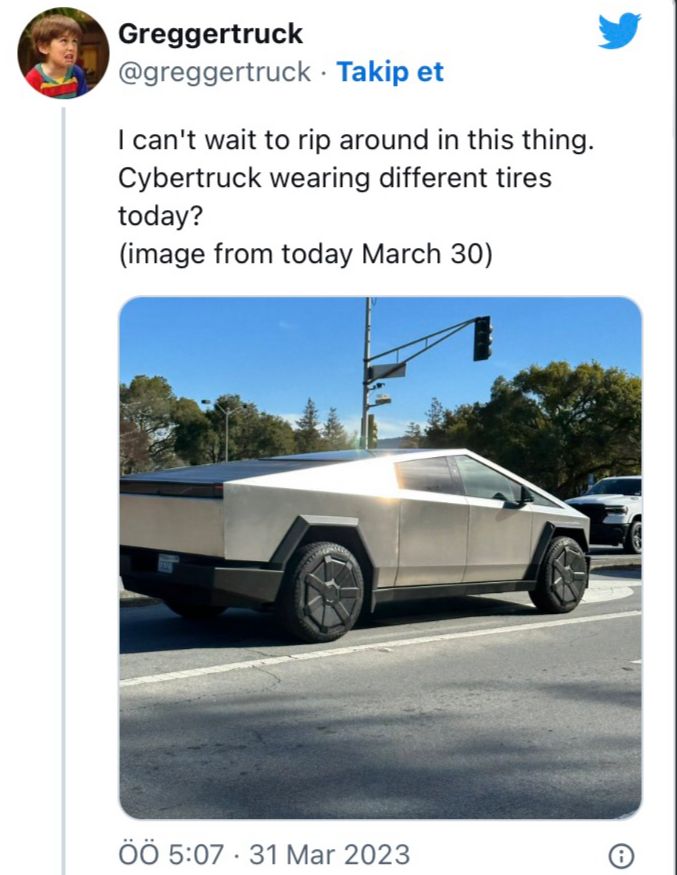 Son həftələrdə sosial media platformasında bir çox “Cybertruck” prototipi paylaşılır. Belə ki, bir twitter istifadəçisi Kaliforniyada gördüyü “Cybertruck” prototipinin müxtəlif görüntülərini paylaşıb. Digər “Cybertruck” prototiplərində açıq ərazi təkərləri olsa da, bu prototipdə aero örtüklü dörd mövsümlük şinlər yer alır. Həmçinin sabit yan aynalarını və işləyən stop lampalarını görmək mümkündür.