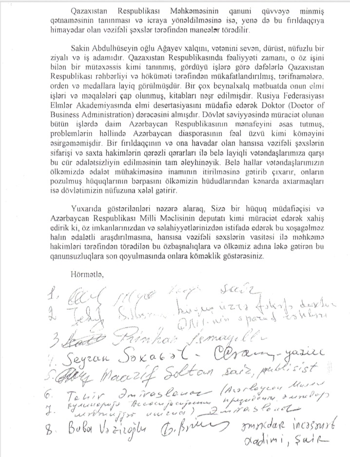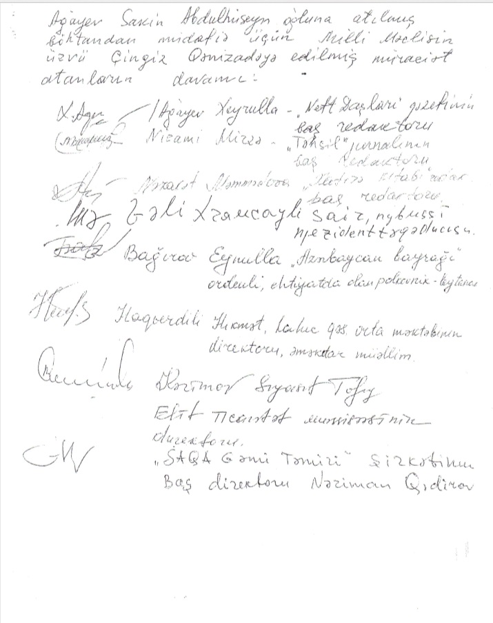 Biz, aşağıda imza edən bir qrup ziyalı Sizə olan sevgi və inamımıza, bu cür hallara qarşı Sizin barışmaz mövqeyinizə əmin olduğumuz üçün müraciət edərək, belə açıq-aydın qərəzli, məqsədli və tam qanunsuz qətnamənin çıxarılmasında iştirak etmiş hər kəsin, istər hakimlərin, istərsə də digər vəzifəli şəxslərin aşkarlanıb cəzalandırılmasını və ədalətin bərpa olunması üçün müvafiq qurumlara göstəriş verməyinizi xahiş edirik.