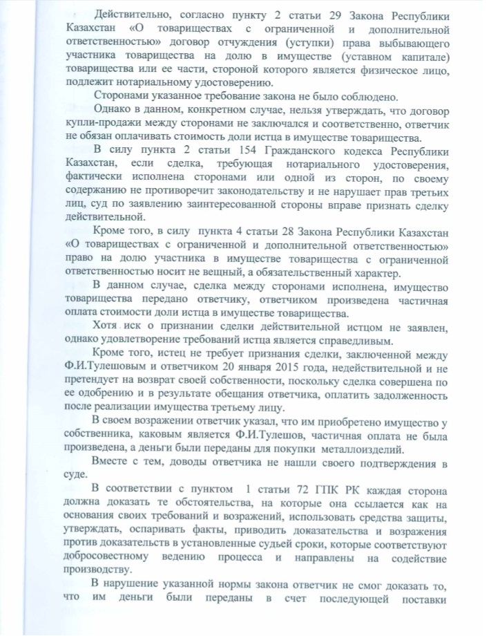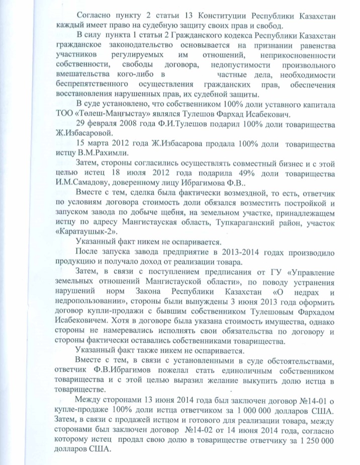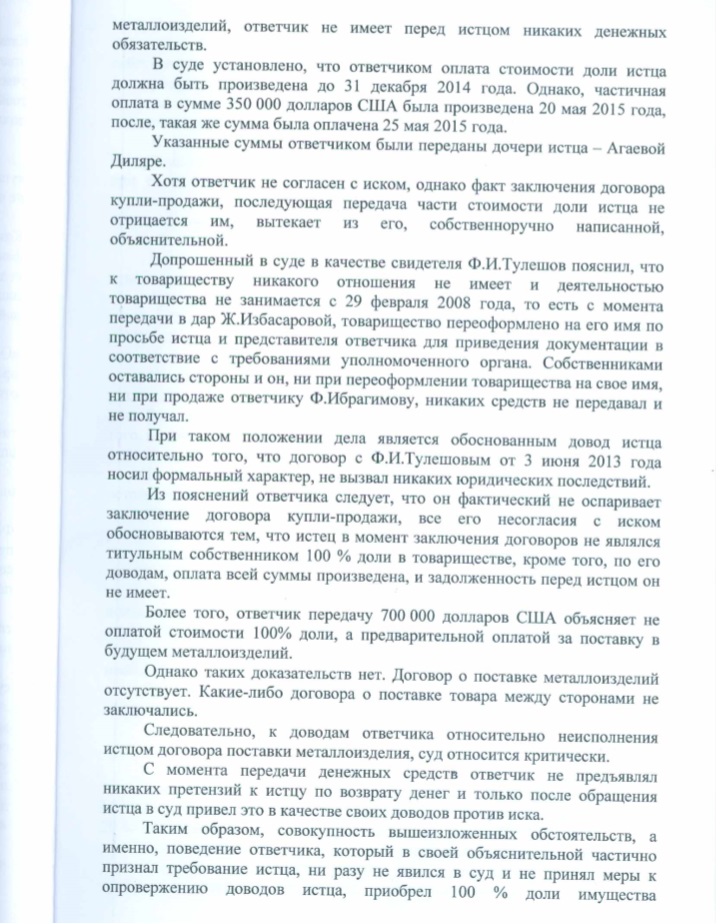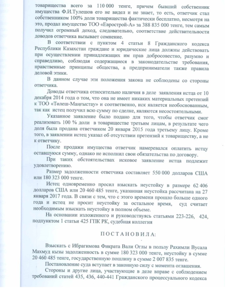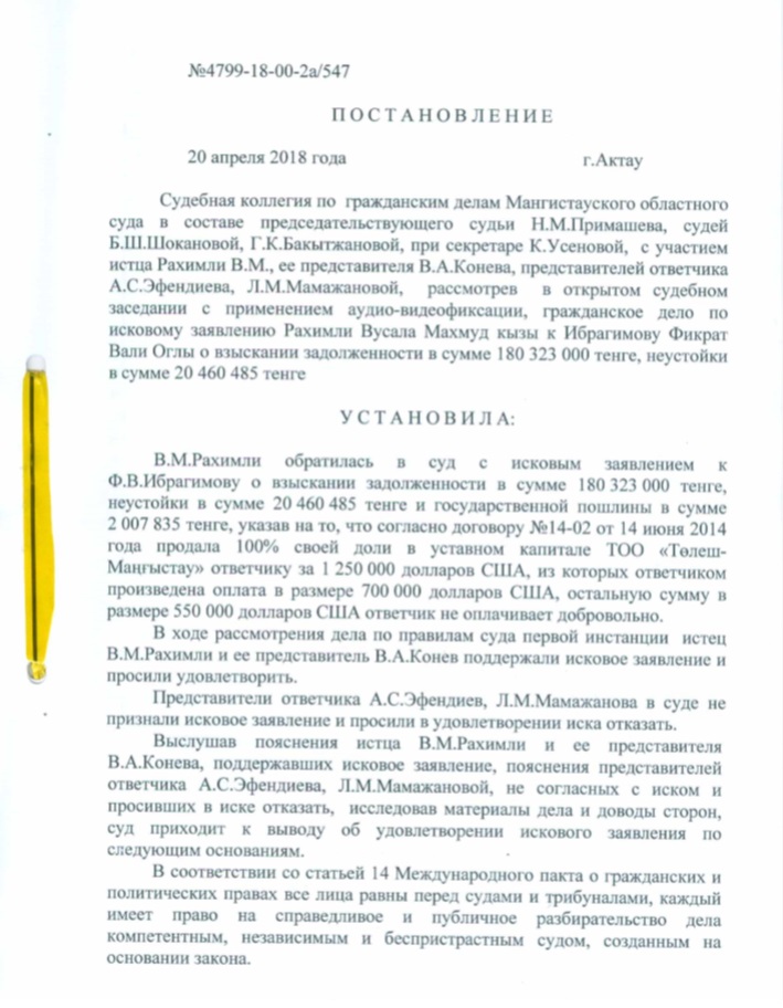 Belə ki, Qazaxstan və Azərbaycan respublikaları arasında bağlanmış hüquqi yardım haqqında müqavilənin tələblərinə zidd olaraq Qazaxstan Respublikası Manqistau Vilayət Məhkəməsinin İbrahimov Fikrət Vəli oğlunun Rəhimli Vüsalə Mahmud qızına borcunu təsdiqləyən qanuni Qətnaməsini tanımalı olduğu halda, Ali Məhkəmə tərəfindən bu Qətnamə əsassız və qanunsuz olaraq təftiş edilir və tanınmasından heç bir əsas göstərilmədən imtina edilir.