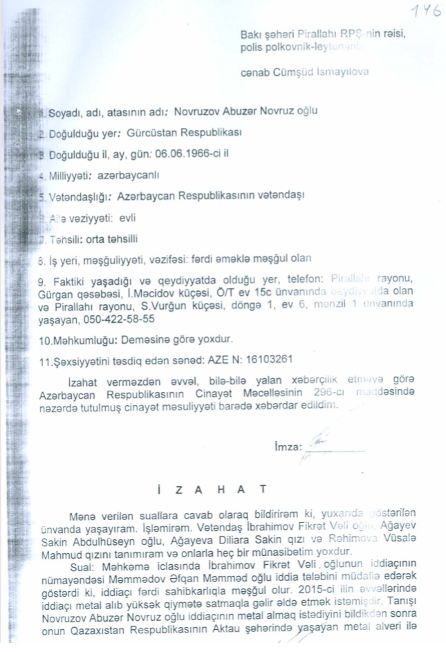 - Mülki işə Pirallahı rayon Məhkəməsi tərəfindən baxılması ərazi aidiyyatı prinsipinin pozulması ilə müşayiət olunmuşdur. İki hüquqi şəxs arasındakı mübahisəyə inzibati-iqtisad məhkəməsində baxılmalı olduğu halda nə üçünsə işə Pirallahı rayon Məhkəməsində baxılması faktı da bu məhkəmə prosesinin qabaqcadan iddiaçının yaxın münasibətdə olduğu hakimlə razılaşdırdığı bir sifariş olduğunu göstərir. Hətta bu saxta iddia işdə adı hallanan fiziki şəxslərə qarşı olsaydı belə, Pirallahı rayon Məhkəməsində bu işə baxılmasına heç bir hüquqi don geyindirmək mümkün olmazdı, yəni iddiaçı və cavabdehlərin heç biri Pirallahı rayonunda pasport qeydiyyatında deyillər və olmamışlar. “İddiaçıya cavabdehin telefon nömrəsini verdiyi üçün” cavabdeh qismində cəlb edilmiş Novruzov Abuzər Novruz oğluna qarşı işə iddiaçı tərəfindən heç bir tələb yönəldilməmiş və məhkəmə tərəfindən onun məhkəmə prosesində iştirakı təmin edilməmişdir. Novruzov A.N. nə iddiaçını, nə də cavabdehləri tanımadığı halda bu işə cəlb edilməsi sadəcə aidiyyətin Pirallahı Rayon Məhkəməsinə verilməsi üçün lazım olmuşdur. Bunu məhkəmənin çıxardığı xüsusi qərardadın araşdırılması zamanı A.N. Novruzovun verdiyi ifadə və izahatı da təsdiq edir. İş üzrə cavabdeh olan Novruzov A.N. Pirallahı RPİ-nin rəisi, polis polkovniki Cümşüd İsmayılovun adına verdiyi izahatında göstərmişdir ki, o nə iddiaçı İbrahimov Fikrət Vəli oğlunu, nə də cavabdehlər Ağayev Sakin Abdulhüseyn oğlu, Rəhimova Vüsalə Mahmud qızı və Ağayeva Dilarə adlı şəxsləri tanıyır və nə də onlarla hansısa bir münasibəti olub (A.N.Nozruzovun izahatı müraciətə əlavə olunur). Göründüyü kimi mülki işə iddianın inzibati iqtisad məhkəməsinə deyil, məhz Pirallahı rayon Məhkəməsinə verilməsi üçün Novruzov A.N. cavabdeh qismində formal olaraq cəlb edilmişdir.