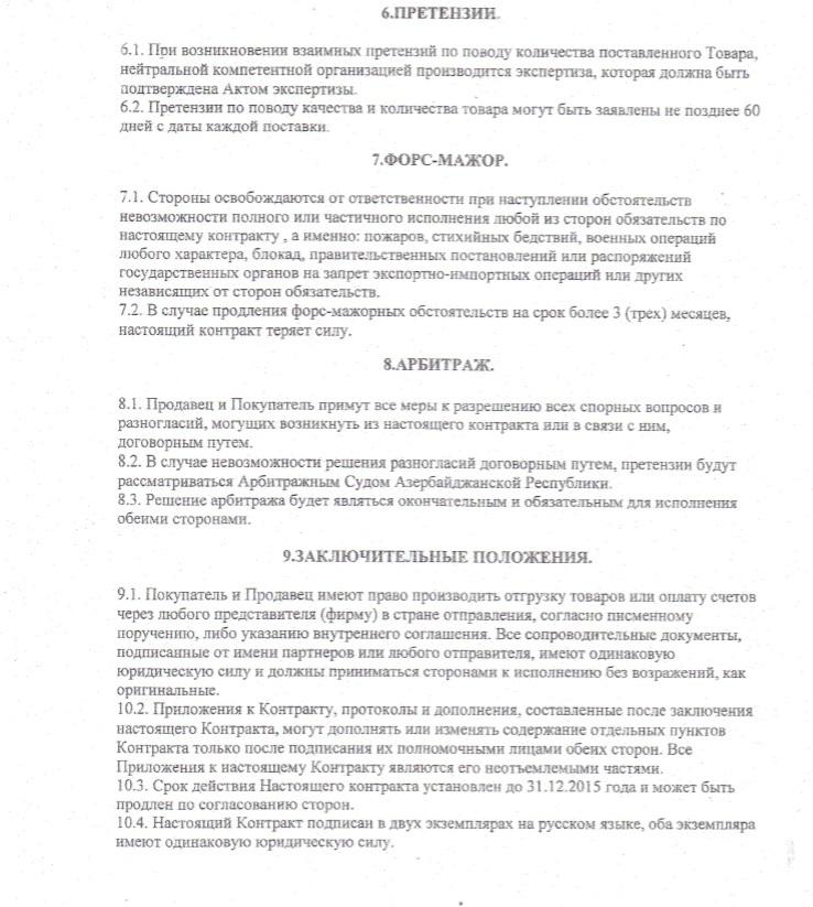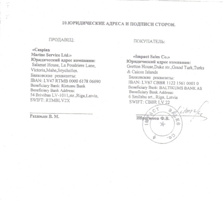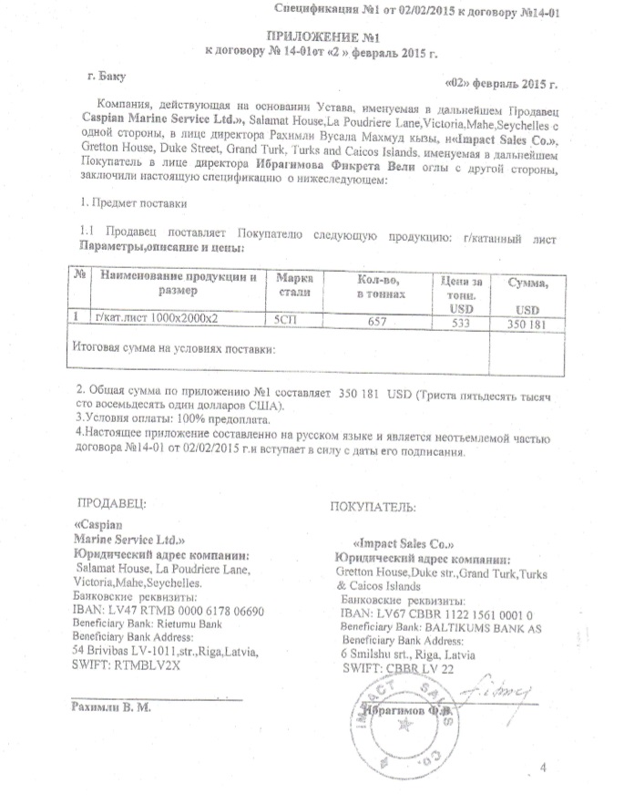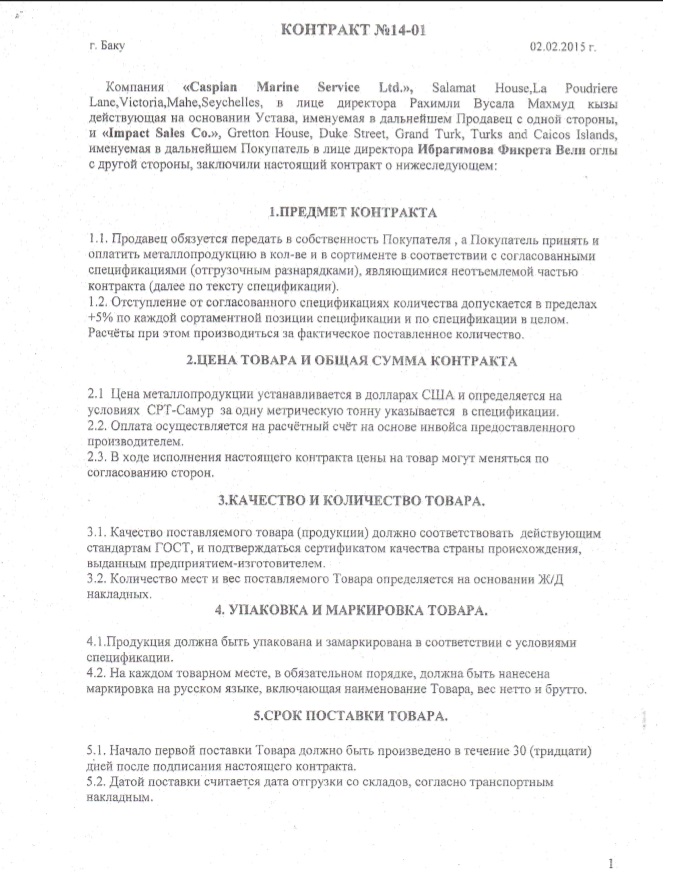 - Məhkəmənin əsas kimi qəbul etdiyi iki hüquqi səxs arasında olan 14-01 nömrəli 02.02.2015 il tarixli «müqavilə» ancaq iddiaçı “İmpact Sales Co” şirkətinin direktoru İbrahimov Fikrət Vəli oğlu tərəfindən imza edilərək möhürlənsə də, “Caspian Marine Service Ltd” tərəfindən bu sənəd nə imzalanmış, nə də möhürlənmişdir (saxta və imzasız müqavilə müraciətə əlavə olunur). Qarşı tərəf iradə ifadəsini bildirmədiyinə görə həmin «müqavilə»-nin sübut kimi qəbul olunması tam qanunsuzdur. İş materiallarından göründüyü kimi iddiaçı İbrahimov Fikrət Vəli oğlu və cavabdeh Rəhimli Vüsalə Mahmud qızı və ya onun ailə üzvləri arasında hər hansı bir müqavilə mövcud olmamış və iddiaçı tərəfindən cavabdehlərə olmayan müqavilə üzrə heç bir ödəniş həyata keçirilməmişdir.