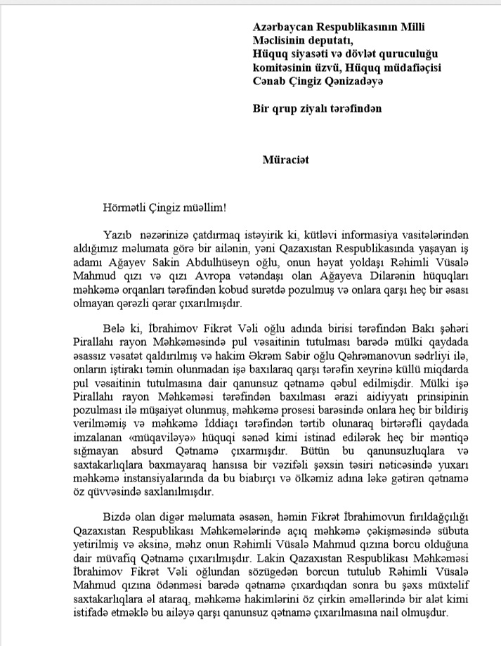 Biz, bir qrup ziyalı, bu ilin əvvəlində Milli Məclisin deputatı, hüquq siyasəti və Dövlət quruculuğu komitəsinin üzvü cənab Çingiz Qənizadəyə müraciət edərək bu xoşagəlməz halın ədalətli araşdırılmasına, hansısa vəzifəli şəxslərin vasitəsi ilə məhkəmə hakimləri tərəfindən törədilən bu özbaşınalıqlara və ölkəmiz adına ləkə gətirən bu qanunsuzluqlara son qoyulmasında köməklik göstərməsini xahiş etmişdik.