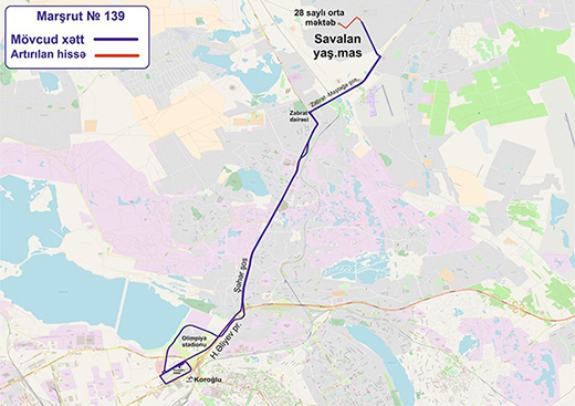 139 nömrəli marşrut xətti üzrə avtobusların hərəkət sxemi uzadılaraq son dayanacaq məntəqəsi Savalan yaşayış massivindəki 28 nömrəli tam orta məktəbin qarşısındakı ərazi müəyyən edilib.