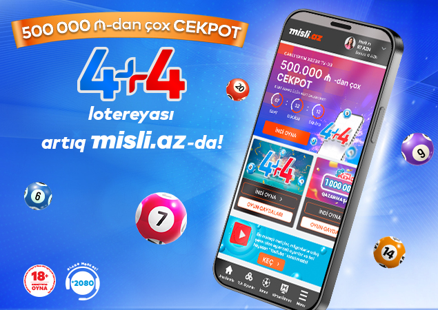 Həftədə 4 dəfə - bazar ertəsi, çərşənbə, cümə və şənbə günləri keçirilən “4+4” oyununda hazırda 500 000 manatdan böyük cekpot şanslı qalibini gözləyir. “Misli.az” saytında “4+4”lə yanaşı, 1 000 000 manat böyük uduşlu “Super KENO” lotereya biletlərini də onlayn almaq imkanı təqdim olunur.