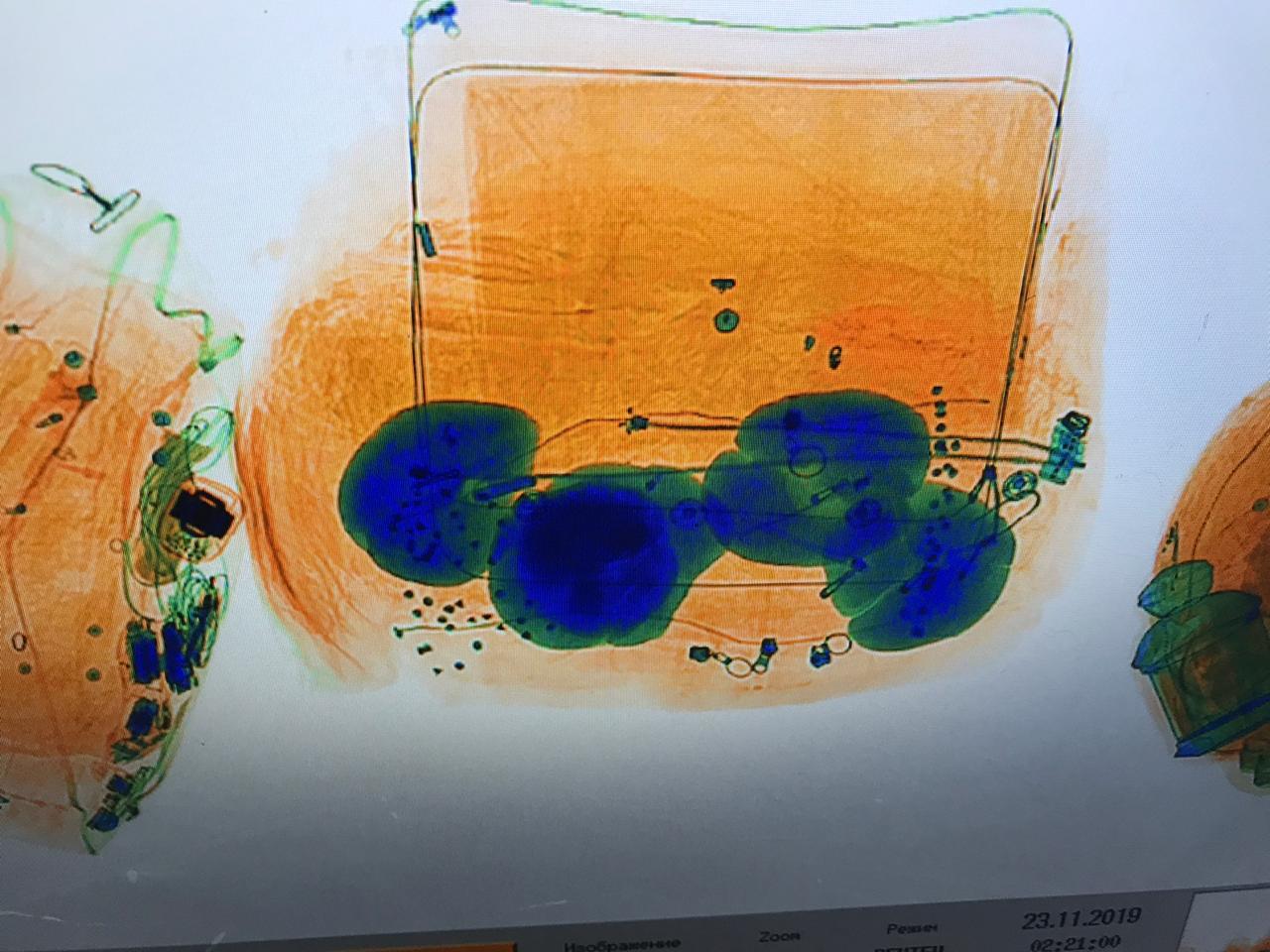 Nəqliyyat vasitəsindəki yüklərə rentgen qurğusu ilə keçirilən baxış zamanı şübhəli predmetlərin təsviri görünüb. Yoxlama zamanı köhnə paltarların arasında, qırmızı xətli çantanın içərisində gömrük orqanlarına bəyan olunmayan 5 ədəd qara sellofan torbalarda ümumi çəkisi 5 kq olan kalium permanqanat aşkarlanıb.
