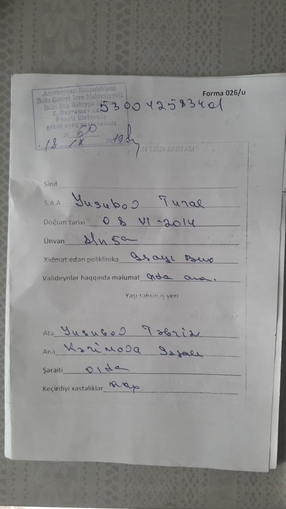 Valideyn səhəri gün yenidən məktəbə yaxınlaşıb sənədləri təqdim etmək istəyən zaman, direktorun müavini olan Nigar adlı şəxs bu dəfə başqa bəhanə gətirərək bildirib ki, sağlamlıq haqqında arayışı başqa rayonun poliklinikası verdiyinə görə bu sənədi qəbul edə bilmərik.