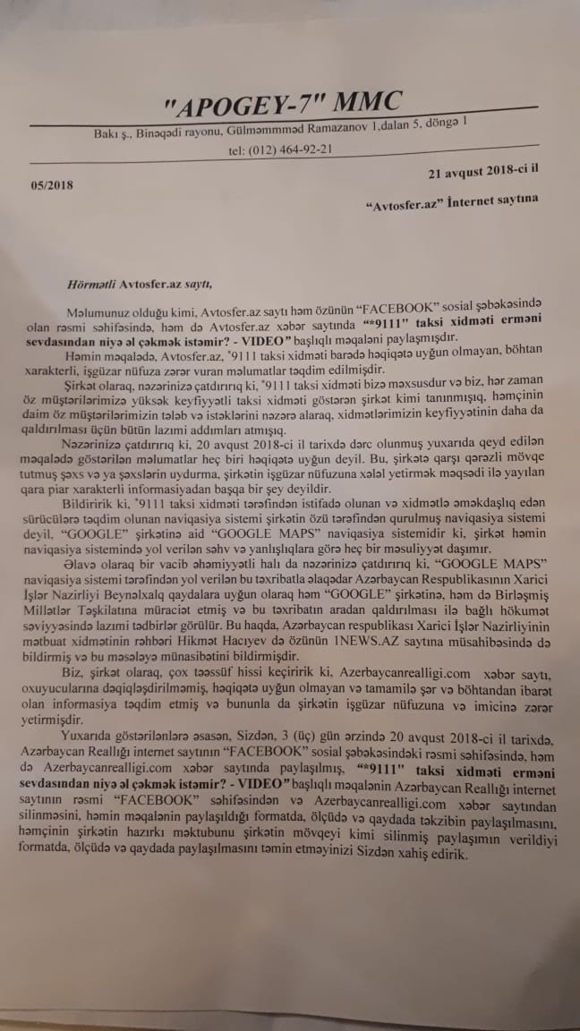20 avqust 2018-ci il tarixində Avtosfer.az saytına “APOGEY-7” MMC şirkətindən 05/2018 saylı məktub daxil olub. Məktubda Avtosfer.az portalında dərc edilmiş təqdim etdiyi “*9111 taksi şirkəti niyə erməni sevdasıdan əl çəkmək istəmir” başlıqlı məqaləsinə münasibət bildirilib. *9111 taksi şirkətinin “işgüzar nüfuzuna ziyan vuran” “böhtan xarakteli” “həqiqətə uyğun olmayan məlumatlar verildiyi” vurğulanır.