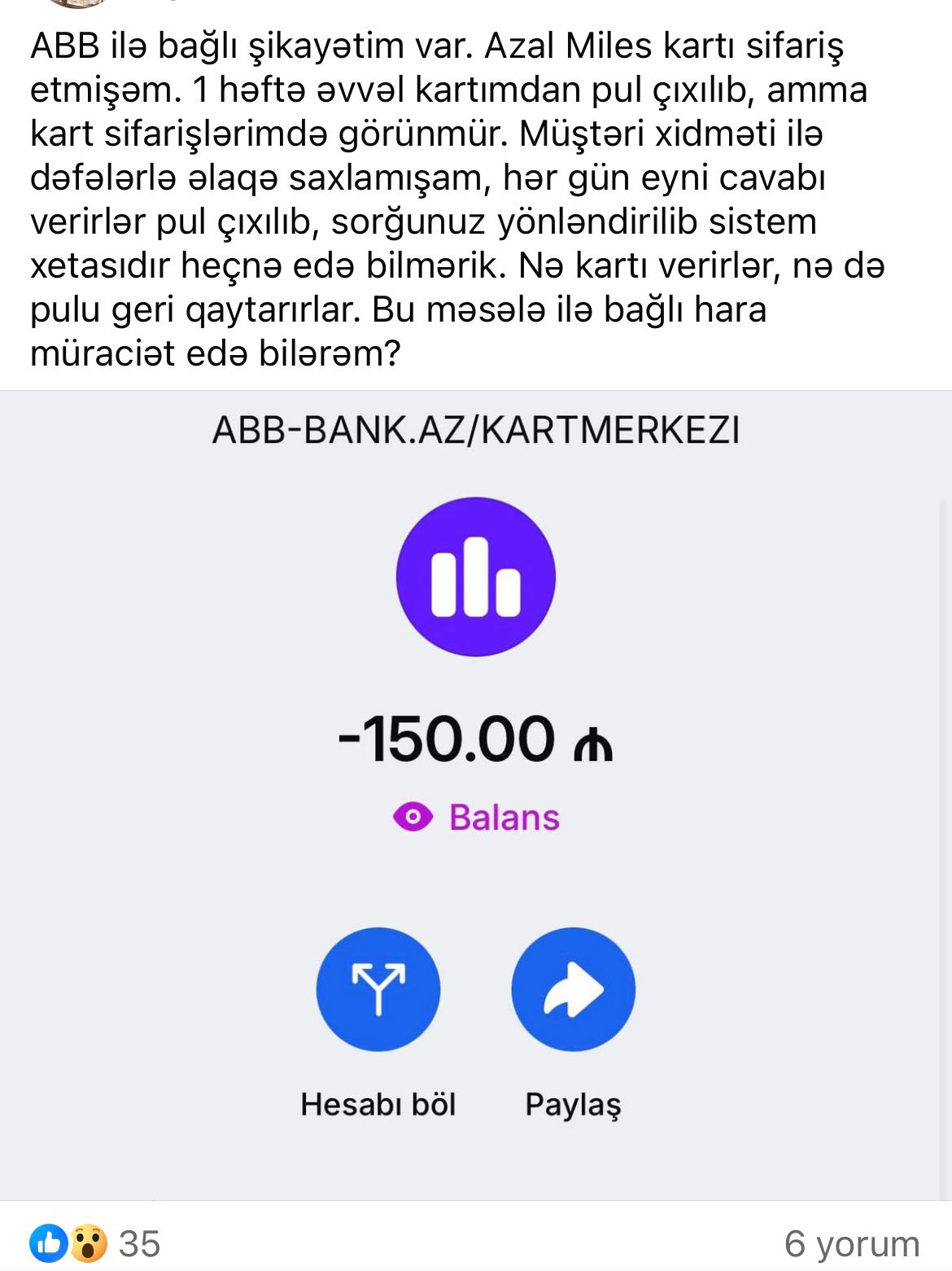 Avtosfer.az xəbər verir ki, belə hadisələrdən biri də vətəndaş və ABB (Azərbaycan Beynəlxalq Bankı) arasında olub. Belə ki, ABB banka müraciət edən vətəndaş AZAL Miles kartı sifariş verib. Sifariş zamanı kartın dəyəri müştəri hesabından çıxılıb. Lakin bundan sonra prosesdə gözlənilməz problemlər yaranıb. Müştərinin iddiasına görə, ödənişdən təxminən bir həftə keçməsinə baxmayaraq kartın sifariş statusu sistemdə görünməyib və heç bir irəliləyiş qeydə alınmayıb.