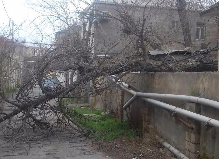 O.Məmmədov qeyd edib ki, Yasamal rayonu Zərdabi küçəsi, 3155-ci məhəllədə sağlam ağacın köhnə tikilinin üzərinə düşərək onu dağıdıb. Nizami rayonunda isə ağac elektrik xəttinin üzərinə üzərinə aşıb: “Lakin ağac aşarkən yanında olan başqa ağacla elektrik xəttinin arasına düşdüyündən elektrik xəttini qıra bilməyib, yəni yandakı ağac onu saxlaya bilib. Buna görə də ərazidə elektrik xəttinin verilişində heç bir problem yaranmayıb”.