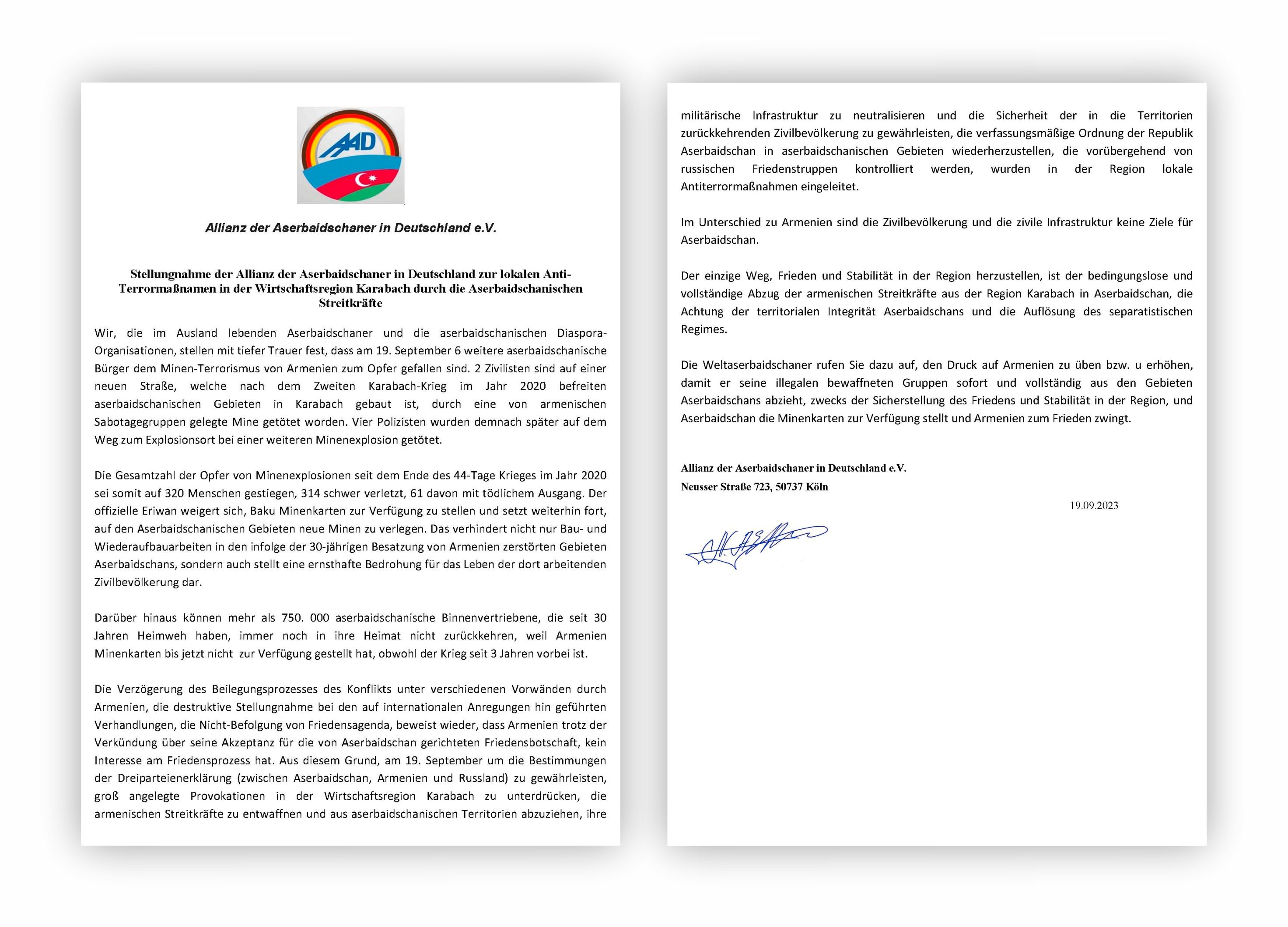 Almaniya Azərbaycanlıları Alyansının adından Almaniya Bundestaqının SPD, SDU və digər müxalif fraksiyalarına (AFD, FDP) ünvanlanan bəyanatda bildirilib ki, Rusiya sülhməramlılarının müvəqqəti nəzarətində olan Xocavənd rayonu ərazisində törədilmiş təxribat və terror nəticəsində Azərbaycanın 2 mülki vətəndaşının və 4 polis əməkdaşının həlak olması xəbəri Azərbaycan əsilli almaniyalıları dərindən narahat edib.