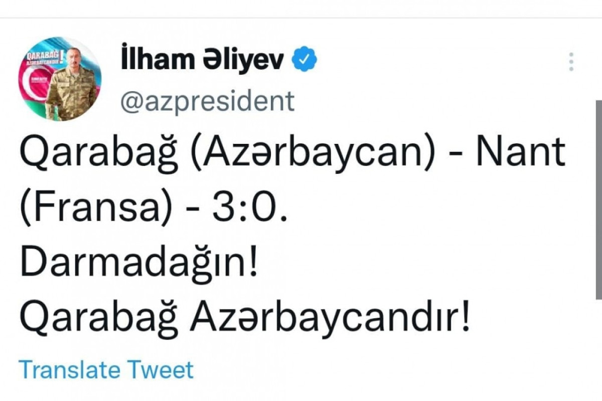 Azərbaycan Prezidenti İlham Əliyev “Qarabağ” – “Nant” qarşılaşması ilə bağlı Tvitterdə paylaşım edib.