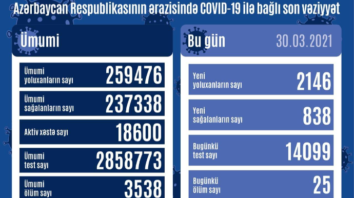 Azərbaycanda koronavirus (COVID-19) infeksiyasına 2 146 yeni yoluxma faktı qeydə alınıb, 838 nəfər müalicə olunaraq sağalıb.