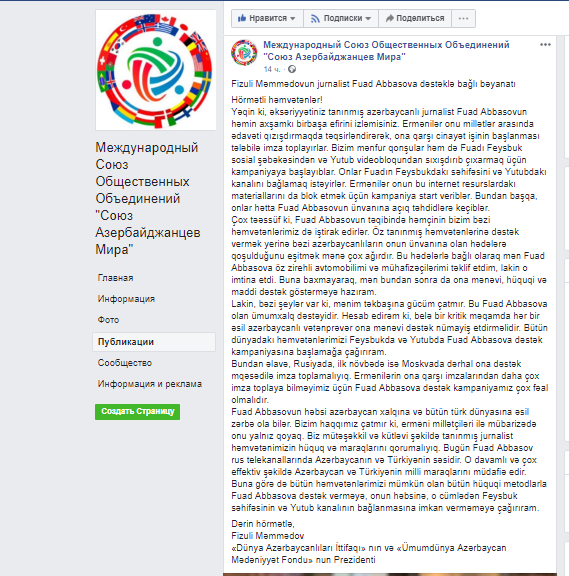 Fuad Abbasovun həbsi azərbaycan xalqına və bütün türk dünyasına əsil zərbə ola bilər. Bizim haqqımız çatmır ki, erməni millətçiləri ilə mübarizədə onu yalnız qoyaq. Biz mütəşəkkil və kütləvi şəkildə tanınmış jurnalist həmvətənimizin hüquq və maraqlarını qorumalıyıq. Bu gün Fuad Abbasov rus telekanallarında Azərbaycanın və Türkiyənin səsidir. O davamlı və çox effektiv şəkildə Azərbaycan və Türkiyənin milli maraqlarını müdafiə edir. Buna görə də bütün həmvətənlərimizi mümkün olan bütün hüquqi metodlarla Fuad Abbasova dəstək verməyə, onun həbsinə, o cümlədən "Facebook" səhifəsinin və "Youtube" kanalının bağlanmasına imkan verməməyə çağırıram".