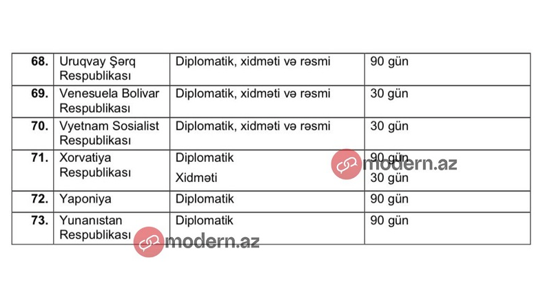 Bundan əlavə, hazırda aşağıda qeyd edilən ölkələr tərəfindən Azərbaycan Respublikasının ümumvətəndaş pasportuna malik vətəndaşları üçün müvafiq müddət çərçivəsində birtərəfli qaydada vizasız gediş-gəliş rejimi tətbiq edilir.