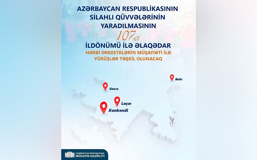 İyunun 26-da Azərbaycan Respublikasının Silahlı Qüvvələrinin yaradılmasının 107-ci ildönümü ilə əlaqədar Bakı, Gəncə, Xankəndi və Laçın şəhərlərinin mərkəzi küçə, prospekt və meydanlarında hərbi orkestrlərin müşayiəti ilə yürüşlər təşkil olunacaq. Avtosfer.az xəbər verir ki, bu barədə Müdafiə Nazirliyinin Mətbuat xidməti məlumat yayıb.