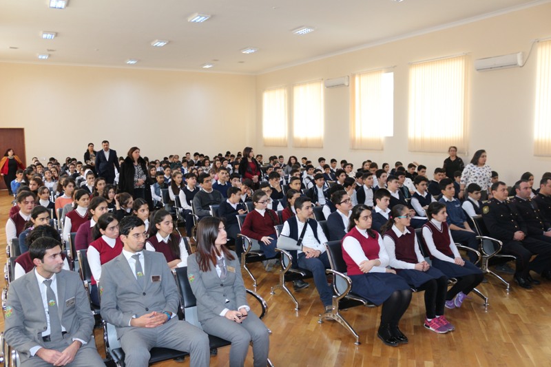 Polis əməkdaşlarının və “ADA” tələbələrinin təqdimatı məktəblilər arasında maraqla qarşılanmış, tədbir şagirdlərlə sual-cavab hissəsi ilə davam etdirilib.