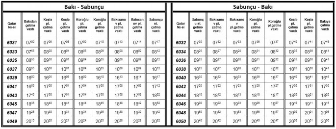 “Azərbaycan Dəmir Yolları” QSC bu gündən başlayaraq mayın 29-na qədər Bakı-Sabunçu-Bakı elektrik qatarının hərəkət cədvəlini açıqlayıb. Avtosfer.az cədvəli təqdim edir. Qeyd edək ki, hər şənbə, bazar və bayram günləri 6031/6032, 6033/6034, 6039/6040 nömrəli elektrik qatarları hərəkətdə olmayacaq. Mayın 30-dan qatarların yeni hərəkət cədvəli haqqında əlavə məlumat veriləcək.