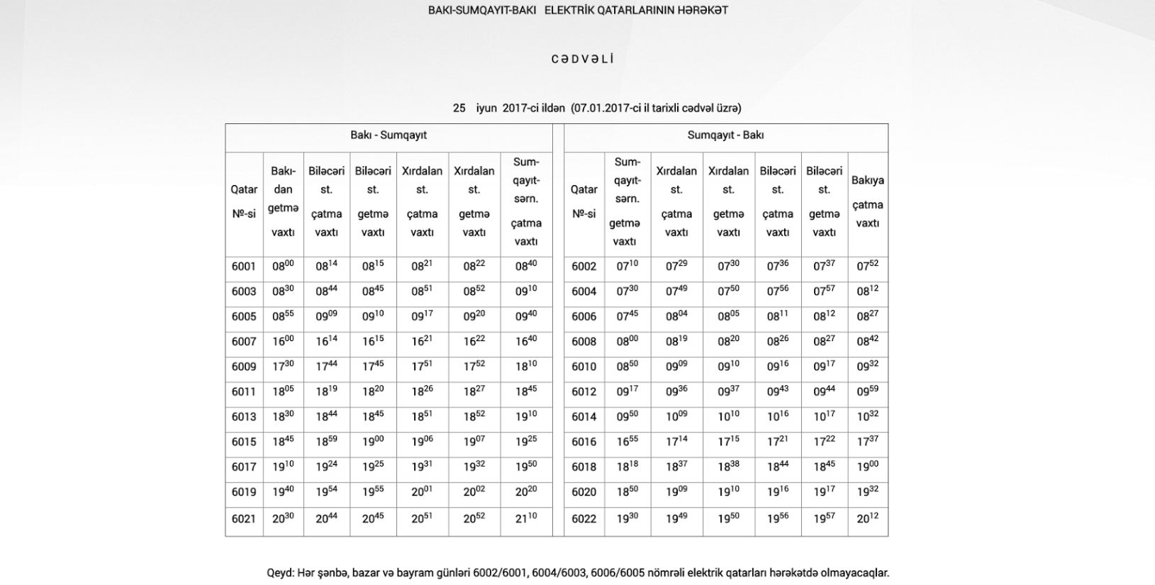 Bakı-Sumqayıt-Bakı elektrik qatarının hərəkət cədvəli dəyişir - CƏDVƏL