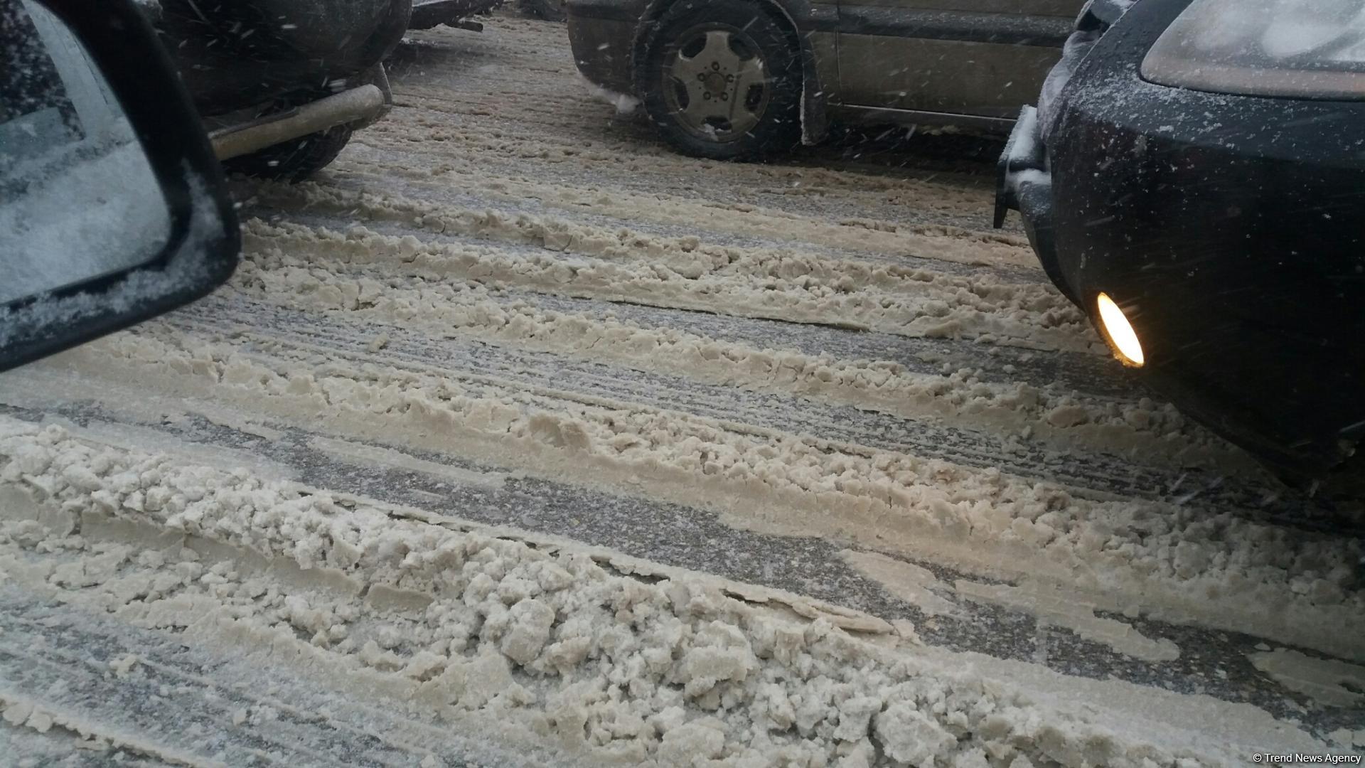 Yol zolağı qarla örtüldüyündən avtomobillərin hərəkətində çətinlik yaranıb