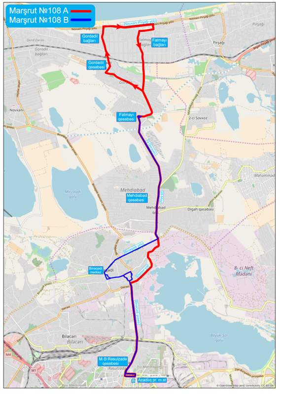 108 nömrəli marşrut xətti Sərnişindaşımada təkmilləşdirmə işləri çərçivəsində (metronun “Azadlıq” stansiyası – Mehdiabad qəsəbəsi – Fatmayı qəsəbəsi) ləğv edilərək fəaliyyətini “108 A” və “108 B” olmaqla davam etdirəcək. Dəyişikliyə əsasən, “108 A” nömrəli müntəzəm marşrutun başlanğıc dayanacaq məntəqəsi Goradil qəsəbəsi, son dayanacaq məntəqəsi “Azadlıq” metrostansiyası olmaqla, “108 B” nömrəli müntəzəm marşrutun başlanğıc dayanacaq məntəqəsi Fatmayı qəsəbəsi, son dayanacaq məntəqəsi “Azadlıq” metrostansiyası olmaqla müəyyən edilib. Dəyişiklik nəticəsində Fatmayı bağları (Çimərlik) və Mehdiabad qəsəbə sakinlərinin “Azadlıq prospekti” metrostansiyasına daşınmasınıın faziləsizliyi və təhlükəsizliyi təmin ediləcək.