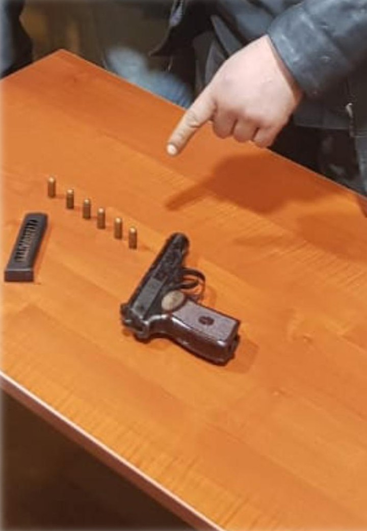 Onun üzərində şəxsi axtarış aparılan zaman 1 ədəd atəşə yararlı “Makarov” markalı tapança, 1 ədəd patron darağı və 6 ədəd patron aşkar olunaraq maddi sübut kimi götürülüb.