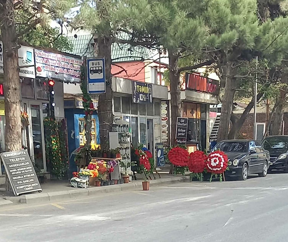 7-ci mikrorayon, Abay Kunanbayev küçəsində bir gül mağazası (“Sənan market”lə üzbəüz) var. Mağazanın qarşısında avtobus dayanacaq məntəqəsi yerləşir. Mağaza həmin yerdə satdığı məhsulları - gül, dibçək, dibçək torpağı və s. səkiyə düzüb piyadanın yolunu daraldır.