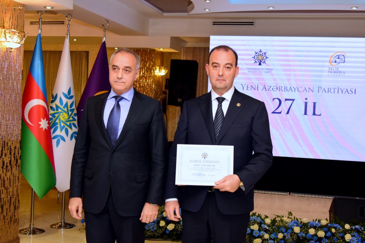 Tədbirin rəsmi hissəsi bitdikdən sonra partiyanın və rayon təşkilatının ictimai-siyasi həyatında fəal iştirakına görə bir qrup şəxs fəxri fərmanla təltif edildi. Yeni Azərbaycan Partiyası sıralarına yeni üzv qəbul edilmiş şəxslərə üzvlük vəsiqələri təqdim olundu.