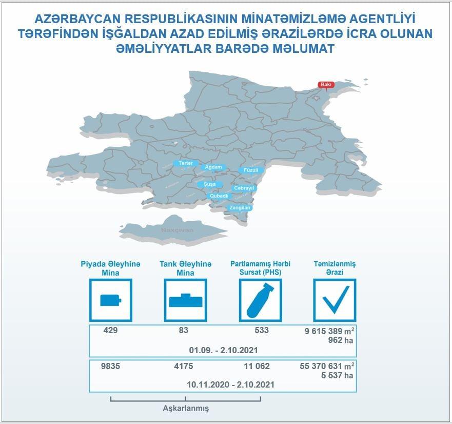 Sentyabrın 1-dən oktyabrın 2-dək Tərtər, Ağdam, Füzuli, Şuşa, Qubadlı, Cəbrayıl və Zəngilan rayonlarının ərazilərində aparılmış əməliyyat-axtarış tədbirləri zamanı piyada əleyhinə 429, tank əleyhinə 83 mina və 533 ədəd partlamamış hərbi sursat aşkarlanıb.