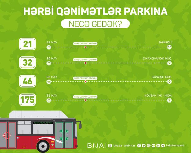 Bildirilib ki, parka getmək üçün vətəndaşlar metronun 28 May stansiyasının qarşısından 21, 32, 46 və 175 nömrəli marşrutlara minərək hərbi qənimətlər parkına gedə bilərlər.