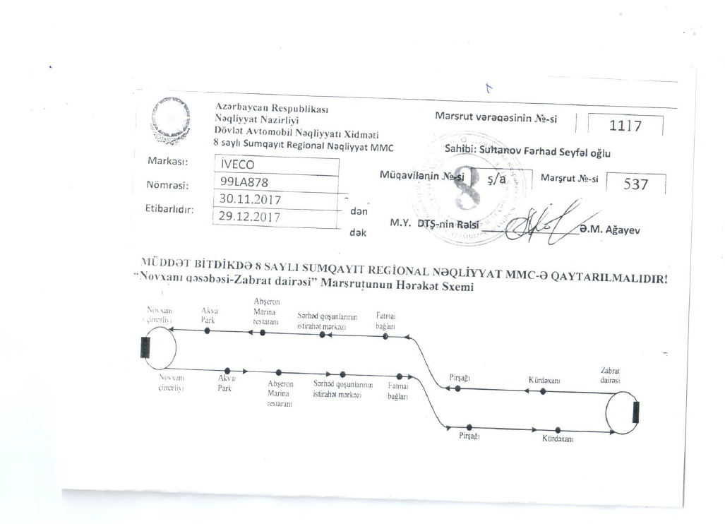 Novxanı qəsəbəsi-Zabrat dairəsi istiqamətində müntəzəm sərnişindaşıma fəaliyyəti göstərən daşıyıcılardan, eləcə də sərnişinlərdən qanunsuz sərnişindaşıma ilə bağlı daxil olan şikayətlər var. Avtosfer.az-ın apardığı araşdırma zamanı məlum oldu ki, Eldar Aslanov adlı şəxs dövlət qeydiyyat nömrə nişanı 99 LA 878 olan “İveco Otoyol” markalı avtobusla Novxanı qəsəbəsi-Zabrat dairəsi istiqamətində qeyri-qanuni sərnişindaşıma faəliyyəti göstərir. Eldar Aslanovun idarə etdiyi avtobus Süleymanov Fərhad Seyfəl oğlunun istismarında olan 537 nömrəli marşrut xəttinə aid nəqliyyat vasitəsidir. Qeyd edilən marşrut xətti üzrə nəqliyyat vasitələri “8 saylı Sumqayıt Regional Nəqliyat” MMC tərəfindən verilən fərqlənmə nişanı əsasında fəaliyyət göstərir ki, bu da yalnız Sumqayıt şəhərinin inzibati ərazisində sərnişindaşıma fəaliyyəti ilə məşğul olmağa hüquq verir. Bu səbəbdən də həmin nəqliyyat vasitələrinin Bakı şəhərinin inzibati ərazisində müntəzəm sərnişindaşıma xidməti göstərməsi qeyri-qanunidir. Bu isə qeyd edilən istiqamətdə sərnişindaşıma fəaliyyəti ilə məşğul olan 173 və 185 nömrəli marşrut xəttinin hazırki istismarçılarının haqlı narazılığına səbəb olub.