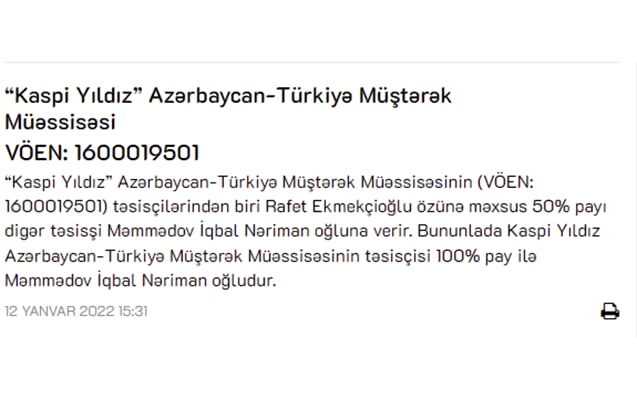 Əldə etdiyimiz digər məlumata görə, şirkətin təsisçilərindən biri Rafet Ekmekçioğlu özünə məxsus 50% payı digər təsisçi Məmmədov İqbal Nəriman oğluna verib. Bununla da “Kaspi Yıldız” Azərbaycan-Türkiyə Müştərək Müəssisəsinin təsisçisi 100% pay ilə Məmmədov İqbal Nəriman oğlu olub.