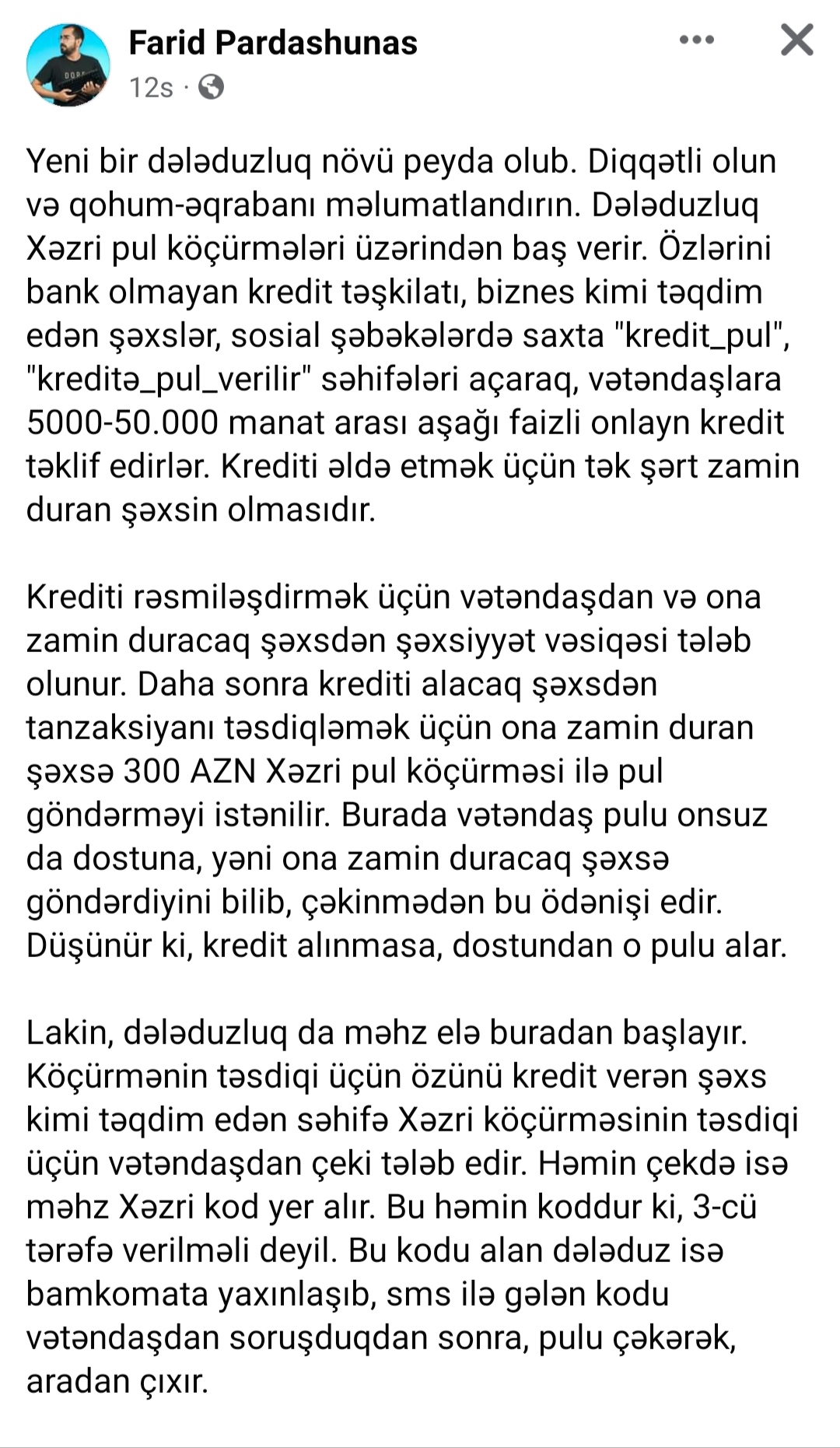 "Yeni bir dələduzluq növü peyda olub. Diqqətli olun və qohum-əqrabanı məlumatlandırın. Dələduzluq Xəzri pul köçürmələri üzərindən baş verir. Özlərini bank olmayan kredit təşkilatı, biznes kimi təqdim edən şəxslər, sosial şəbəkələrdə saxta "kredit_pul", "kreditə_pul_verilir" səhifələri açaraq, vətəndaşlara 5000-50.000 manat arası aşağı faizli onlayn kredit təklif edirlər. Krediti əldə etmək üçün tək şərt zamin duran şəxsin olmasıdır. Krediti rəsmiləşdirmək üçün vətəndaşdan və ona zamin duracaq şəxsdən şəxsiyyət vəsiqəsi tələb olunur. Daha sonra krediti alacaq şəxsdən tanzaksiyanı təsdiqləmək üçün ona zamin duran şəxsə 300 AZN Xəzri pul köçürməsi ilə pul göndərməyi istənilir. Burada vətəndaş pulu onsuz da dostuna, yəni ona zamin duracaq şəxsə göndərdiyini bilib, çəkinmədən bu ödənişi edir. Düşünür ki, kredit alınmasa, dostundan o pulu alar. Lakin, dələduzluq da məhz elə buradan başlayır. Köçürmənin təsdiqi üçün özünü kredit verən şəxs kimi təqdim edən səhifə Xəzri köçürməsinin təsdiqi üçün vətəndaşdan çeki tələb edir. Həmin çekdə isə məhz Xəzri kod yer alır. Bu həmin koddur ki, 3-cü tərəfə verilməli deyil. Bu kodu alan dələduz isə bamkomata yaxınlaşıb, sms ilə gələn kodu vətəndaşdan soruşduqdan sonra, pulu çəkərək, aradan çıxır".