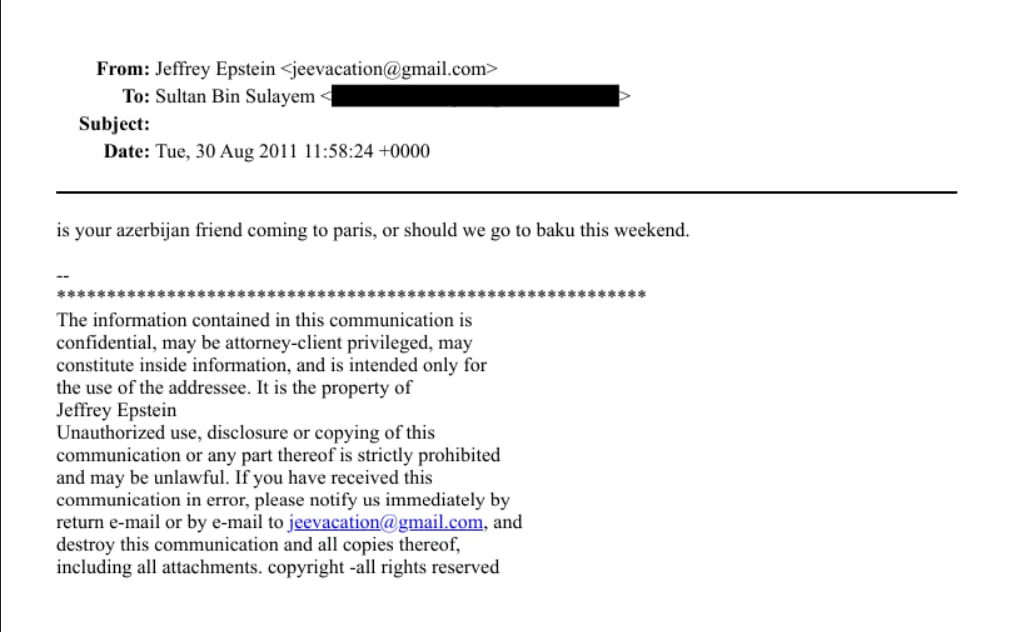 Yeni açıqlanan sənədlər dünya mediasında geniş rezonans doğurduğu kimi, Azərbaycanla bağlı qeydlərin də üzə çıxması diqqət çəkib. Açıqlanan materiallar arasında Epşteynin müxtəlif illərdə yazdığı elektron məktublar xüsusi yer tutur. Bu məktubların bir qismində Azərbaycanın və Bakının adı birbaşa çəkilir. Sənədlərə əsasən, Epşteynin “Sultan bin Sulayem” adlı şəxslə 2011-ci və 2015-ci illərə aid yazışmaları mövcuddur.