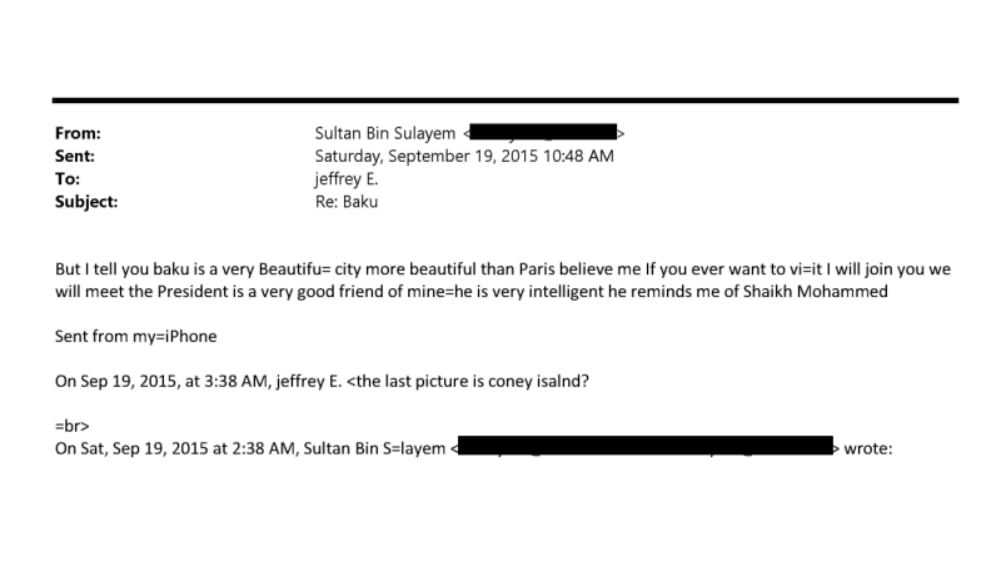 2015-ci ilə aid başqa bir yazışmada isə Sultan bin Sulayem sentyabr ayında Bakıda olduğunu bildirir. O, Bakının fotolarını Epşteynə göndərərək şəhəri yüksək qiymətləndirir: