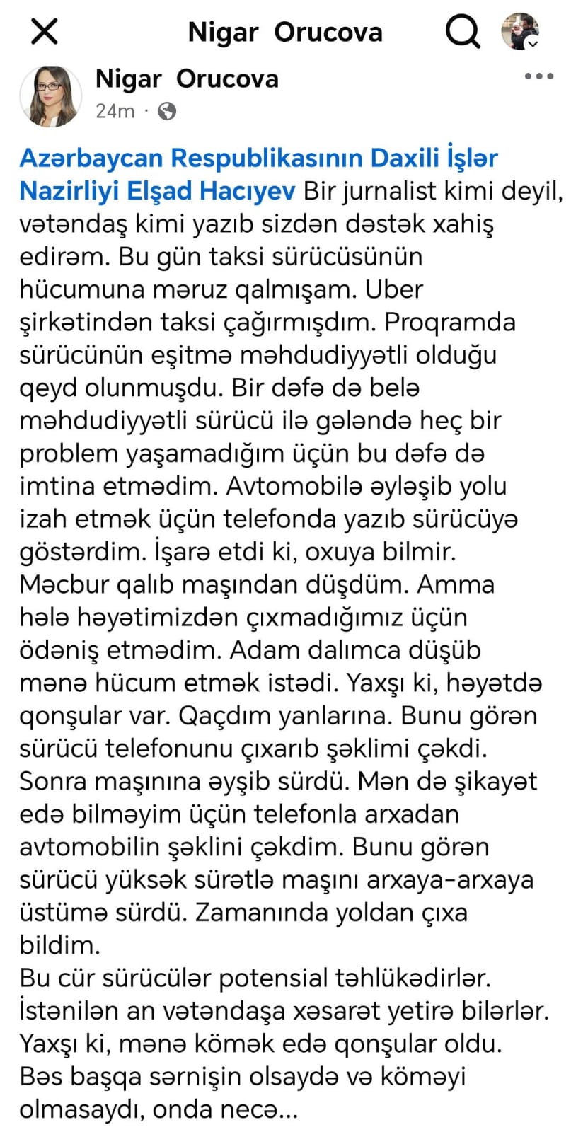 Bakıda taksi sürücüsünün sərnişinə qarşı aqressiv davranışı ilə bağlı ciddi iddia səsləndirilib. Jurnalist Nigar Orucova yaşadığı hadisə ilə bağlı Daxili İşlər Nazirliyinin mətbuat xidmətinin rəisi Elşad Hacıyevə müraciət edərək vətəndaş kimi dəstək istədiyini bildirib.