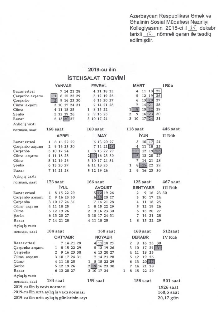 Əmək və Əhalinin Sosial Müdafiəsi Nazirliyinin Kollegiyasının 25 dekabr 2018-ci il tarixli 12 nömrəli qərarı ilə 2019-cu ilin iş vaxtı norması və istehsalat təqvimi təsdiq edilib. Bu barədə Avtosfer.az-a Nazirlikdən məlumat verilib.