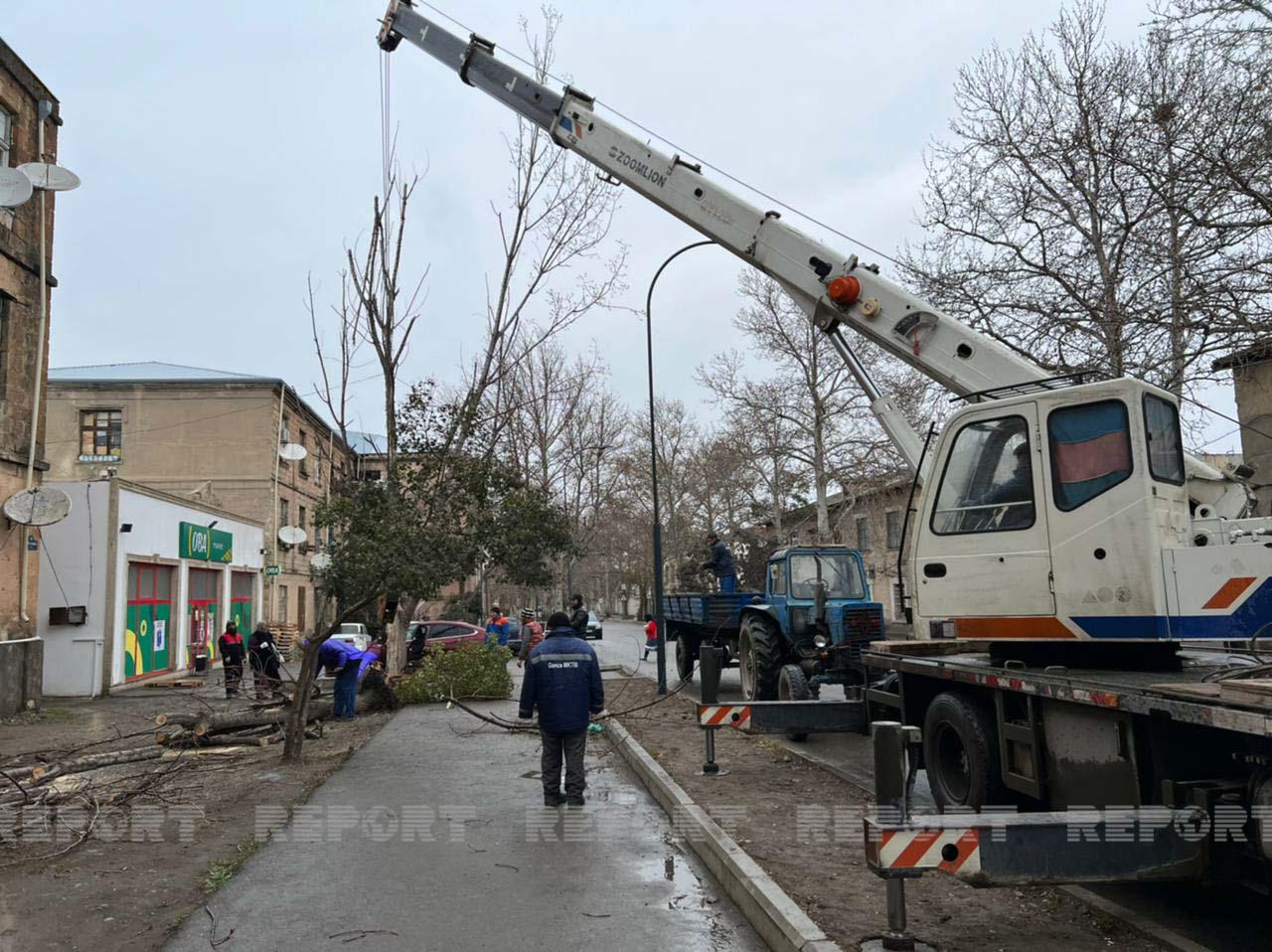 Report-un məlumatına görə, güclü külək nəticəsində bir neçə binanın dam örtüyü dağılıb, elektrik dirəkləri və ağaclar aşıb.